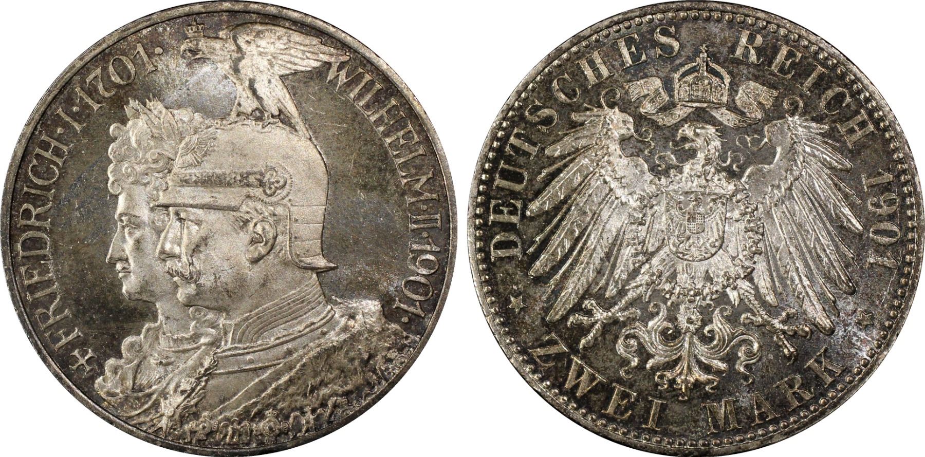 PRUSSIA: Wilhelm II, 1888-1918, AR 2 mark, 1901, KM-525, Jaeger-105, 200th Anniversary of the Kingdom of Prussia, lightly toned, a lovely example! PCGS graded MS66.