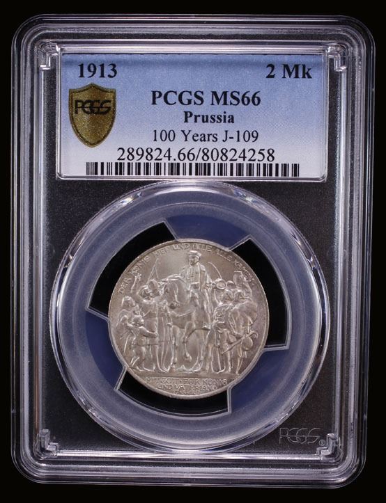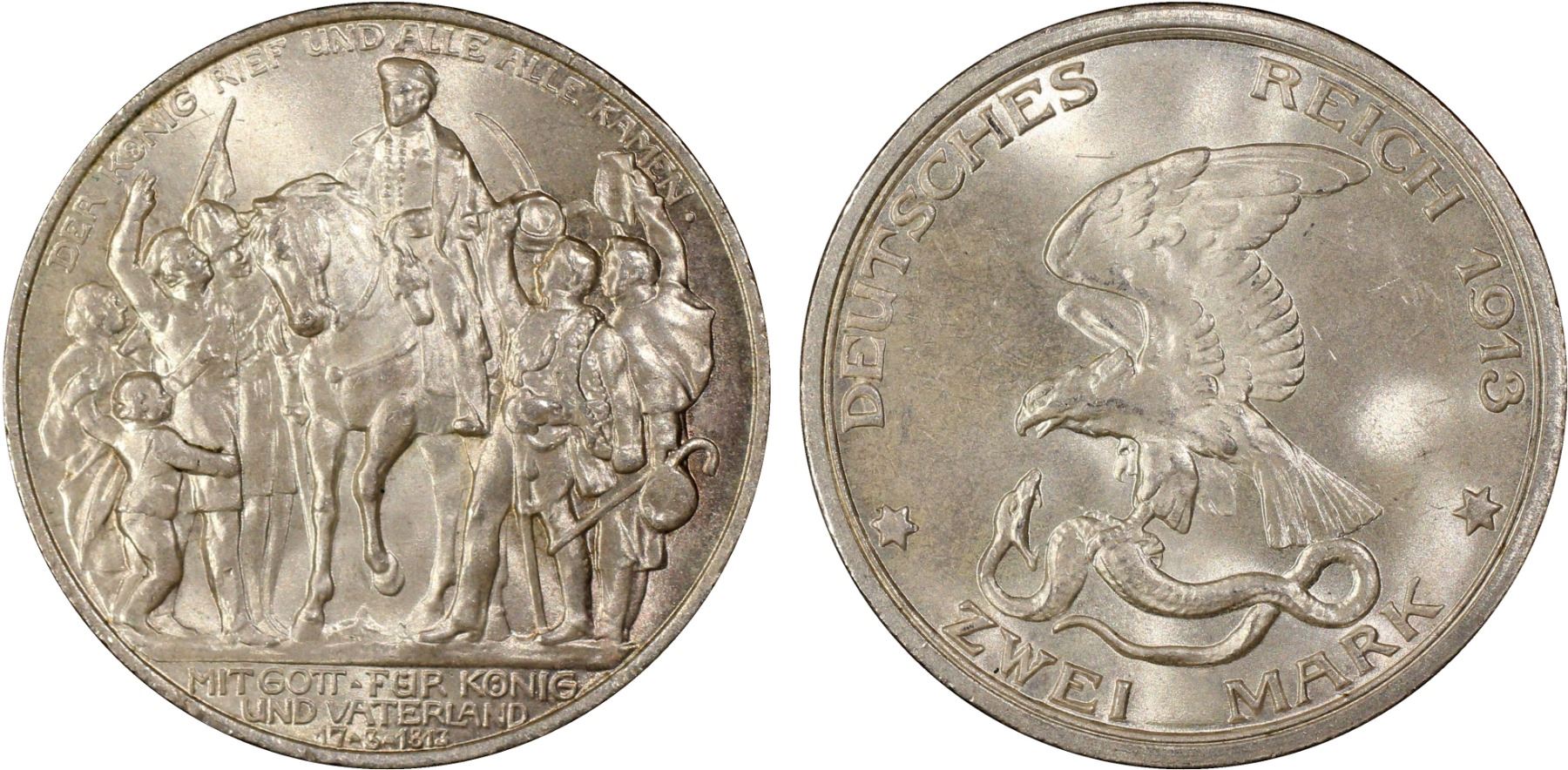 PRUSSIA: Wilhelm II, 1888-1918, AR 2 mark, 1913, KM-532, Jaeger-109, 100th Anniversary-Victory over Napoleon at Leipzig, lustrous, PCGS graded MS66.