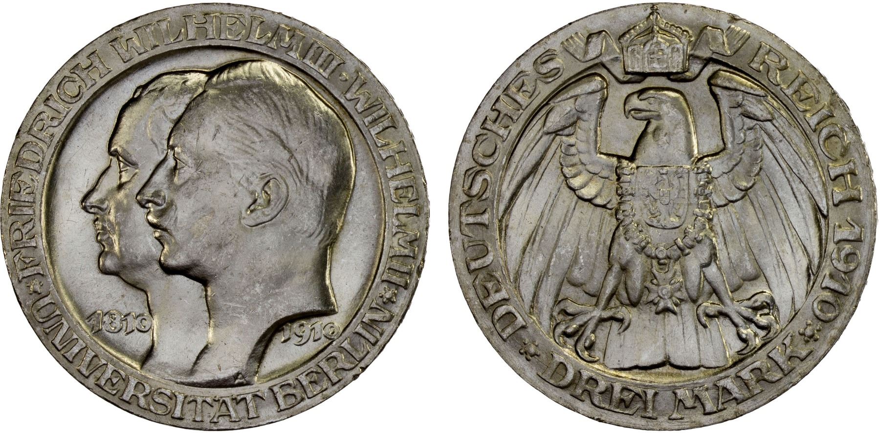 PRUSSIA: Wilhelm II, 1888-1918, AR 3 mark, 1910-A, KM-530, J-107, 100th Anniversary of the University of Berlin, couple faint hairlines, brilliant luster, Unc.