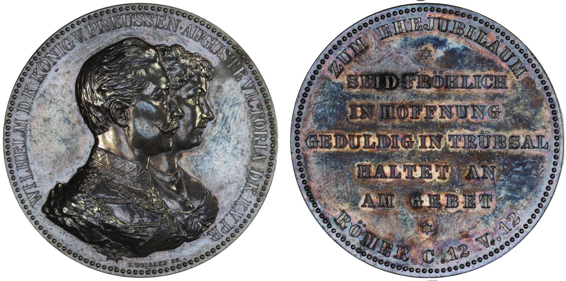 PRUSSIA: Wilhelm II, 1888-1918, AR medal (50.86g), ND (1906), Sommer-W82, 45mm silver medal for the Golden Wedding Anniversary of Wilhelm II and Augusta by Emil Weigand, conjoined busts right with WILHELM D K KONIG F. PREUSSEN AUGUSTE VICTORIA D K K V PR around // "ZUM EHEJUBILAUM / SEID FRÖHLICH / IN HOFFNUNG / GEDULDIG IN TRÜBSAL / HALTET AN / AM GEGET / ROMER C. 12 V.12" (Be joyful in hope, patient in trouble, continue to pray - Romans 12:12), hairlined, but has retoned a beautiful blue color, in original plush case, plain edge, Proof. Emil Weigand was born on November 20, 1837 in Berlin. He eventually began training as a die cutter and engraver at the Academy of Art and School of Engraving in his hometown. After finishing his training, Weigand worked in London from 1863 until he received positions as engraver and medallist at the Berlin Mint in 1866. In 1887, Weigand became appointed as the institution's chief medallist, a title which he held until 1904. During his time at the mint, he designed coins for several entities, including Anhalt, Egypt, German West Africa, Germany, Hamburg, Lübeck, Mexico, Morocco, and Prussia. Weigand died on March 25, 1906, in Berlin.