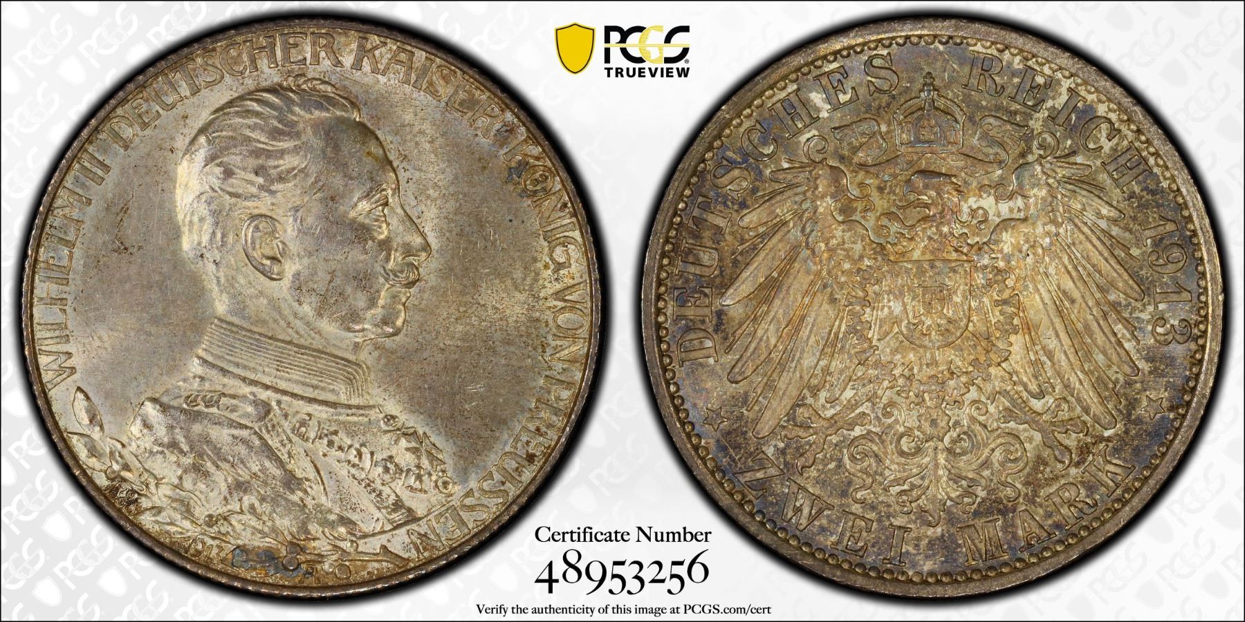 PRUSSIA: Wilielm II, 1888-1918, AR 2 mark, 1913-A, PCGS MS63