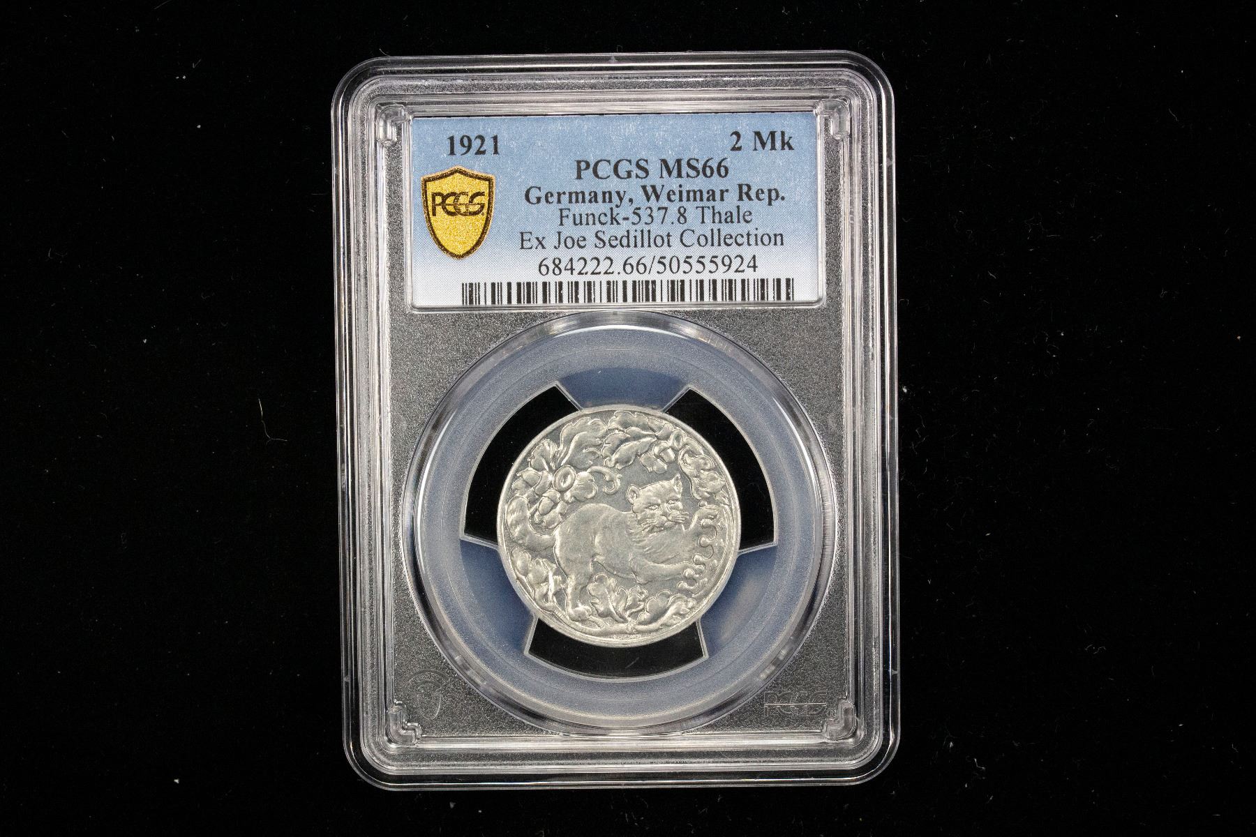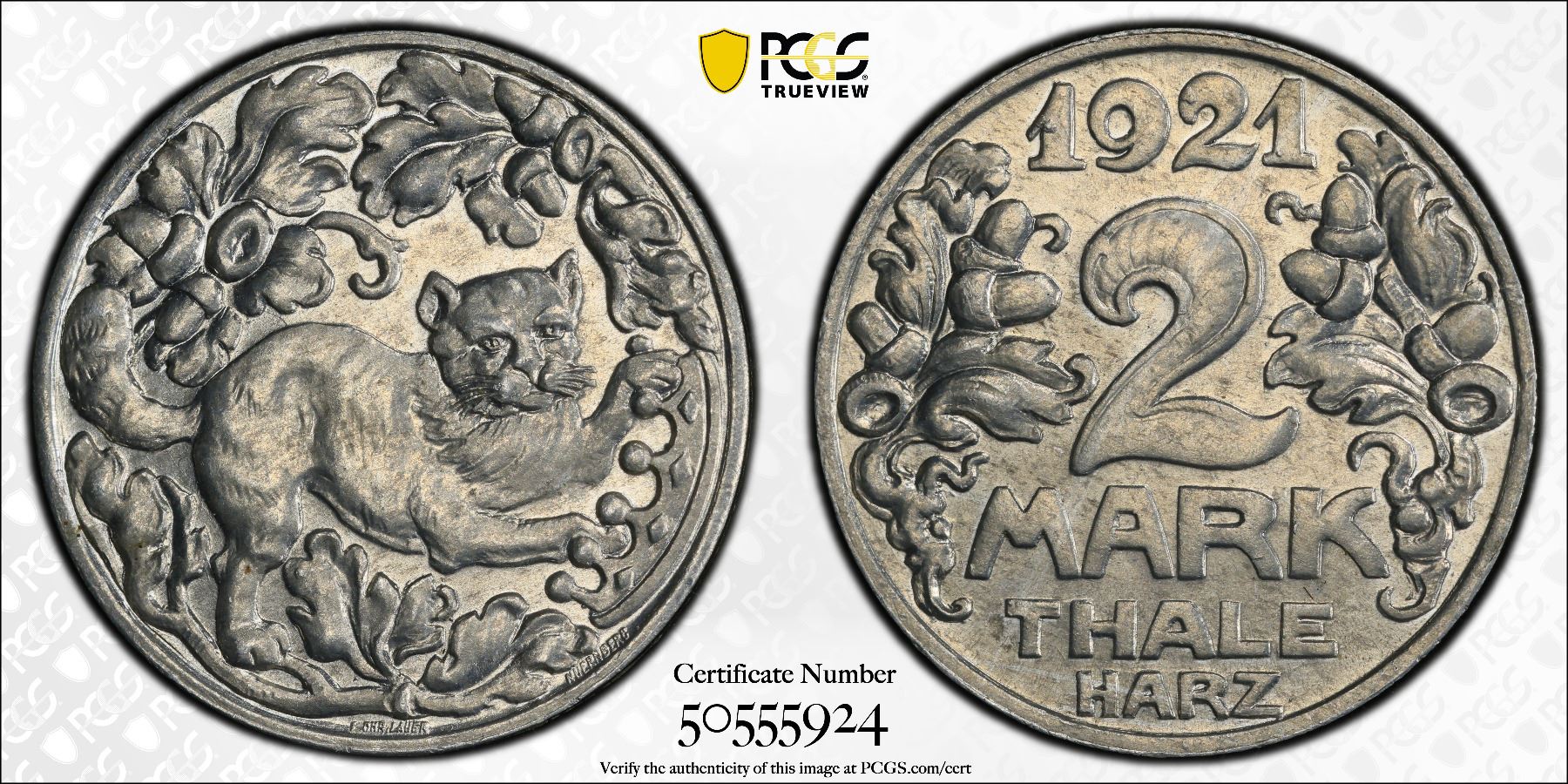 PRUSSIAN SAXONY: 2 mark, Thale am Harz, 1921, Funck-537.8, Men18-31188.1, cat playing with a crown surrounded by oak branches, notgeld in aluminum, struck by Lauer, Nuremberg, a fantastic mint state example! PCGS graded MS66, ex Joe Sedillot Collection. The "Province of Saxony," also known as "Prussian Saxony," was a province within the Kingdom of Prussia, and later the Free State of Prussia, from 1816 until 1944. It was a significant region within Prussia, known for its developed agriculture and industry. Following Prussian dissolution, the territory of the Province of Saxony became part of the state of Saxony-Anhalt in 1947.