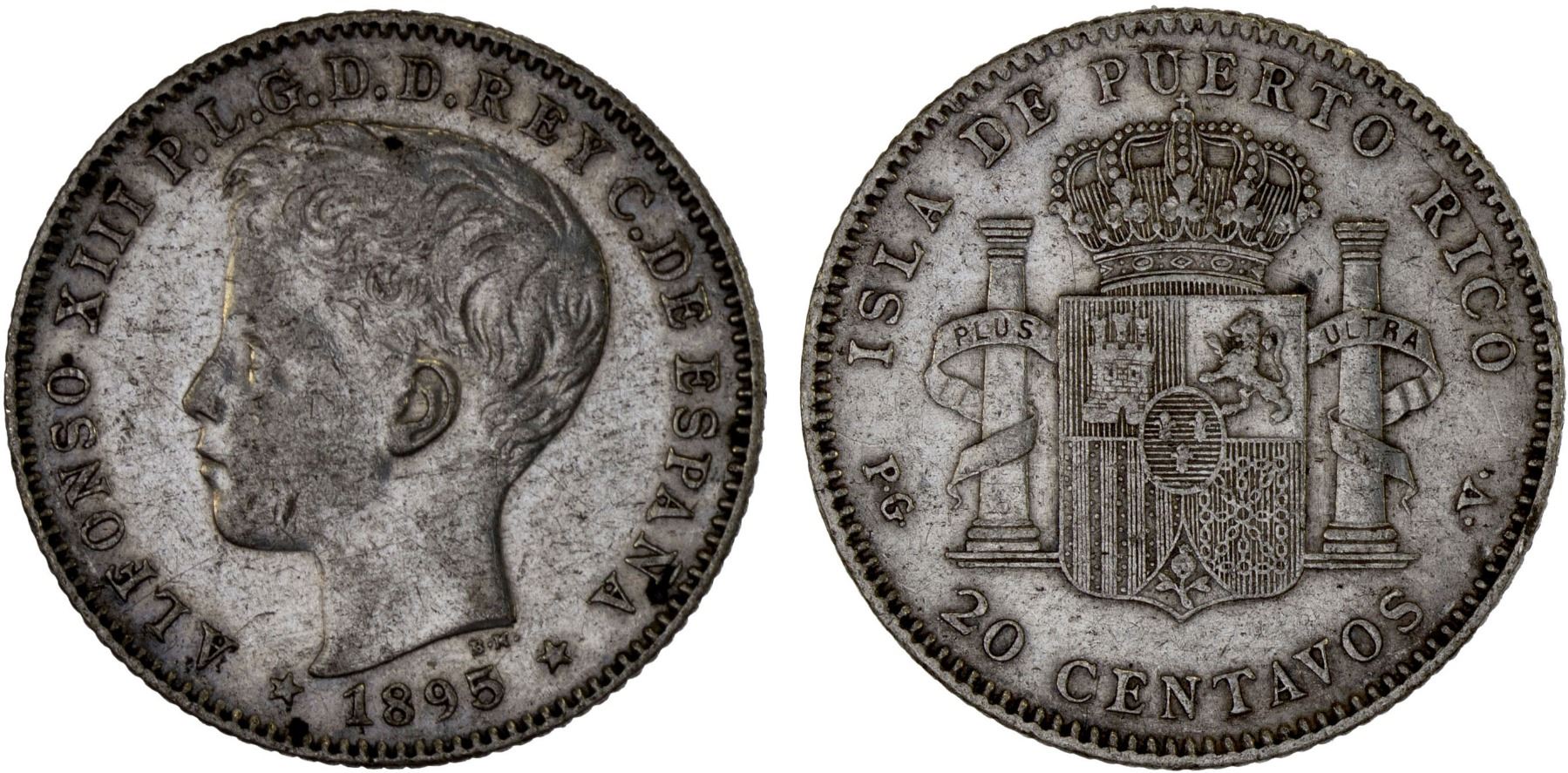 PUERTO RICO: Alfonso XIII, 1886-1898, AR 20 centavos, About XF