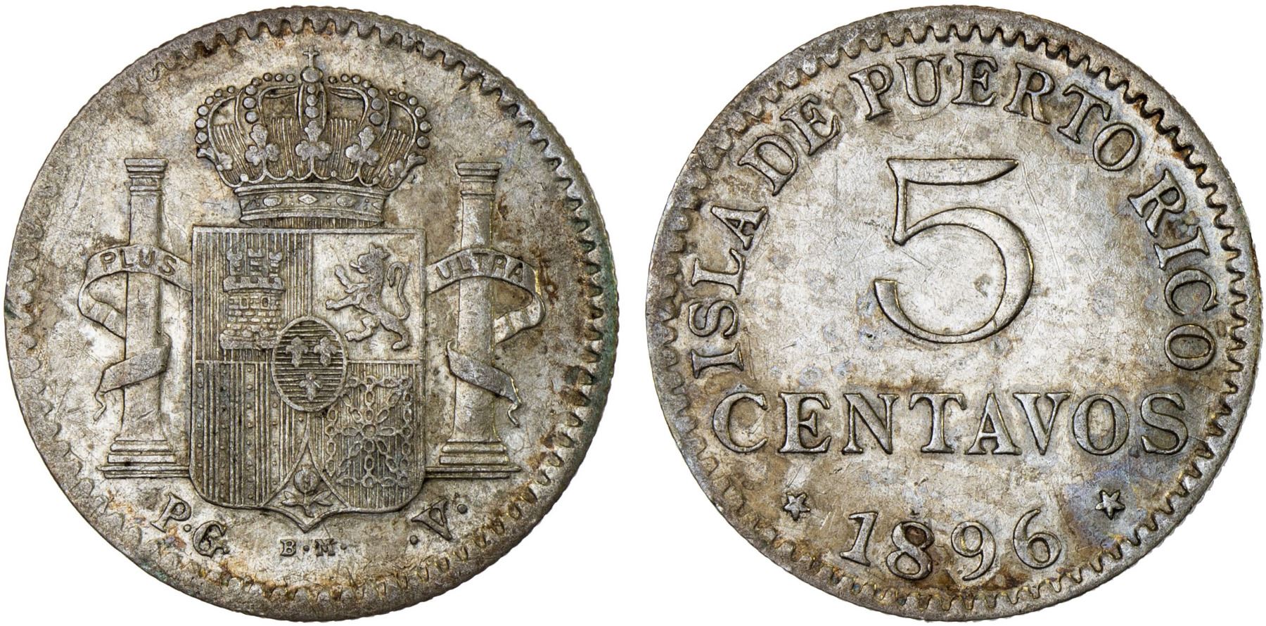 PUERTO RICO: Alfonso XIII, 1886-1898, AR 5 centavos, 1896, VF-XF