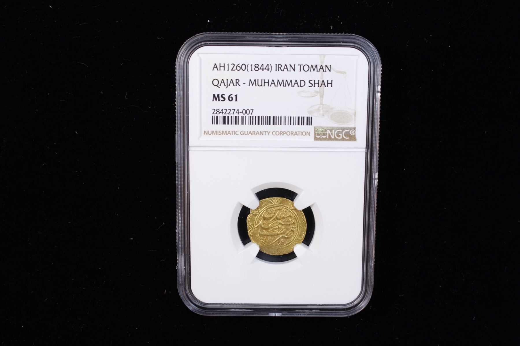 QAJAR: Muhammad Shah, 1837-1848, AV toman, Mashhad Muqaddas, AH1260, A-2904, NGC graded MS61.