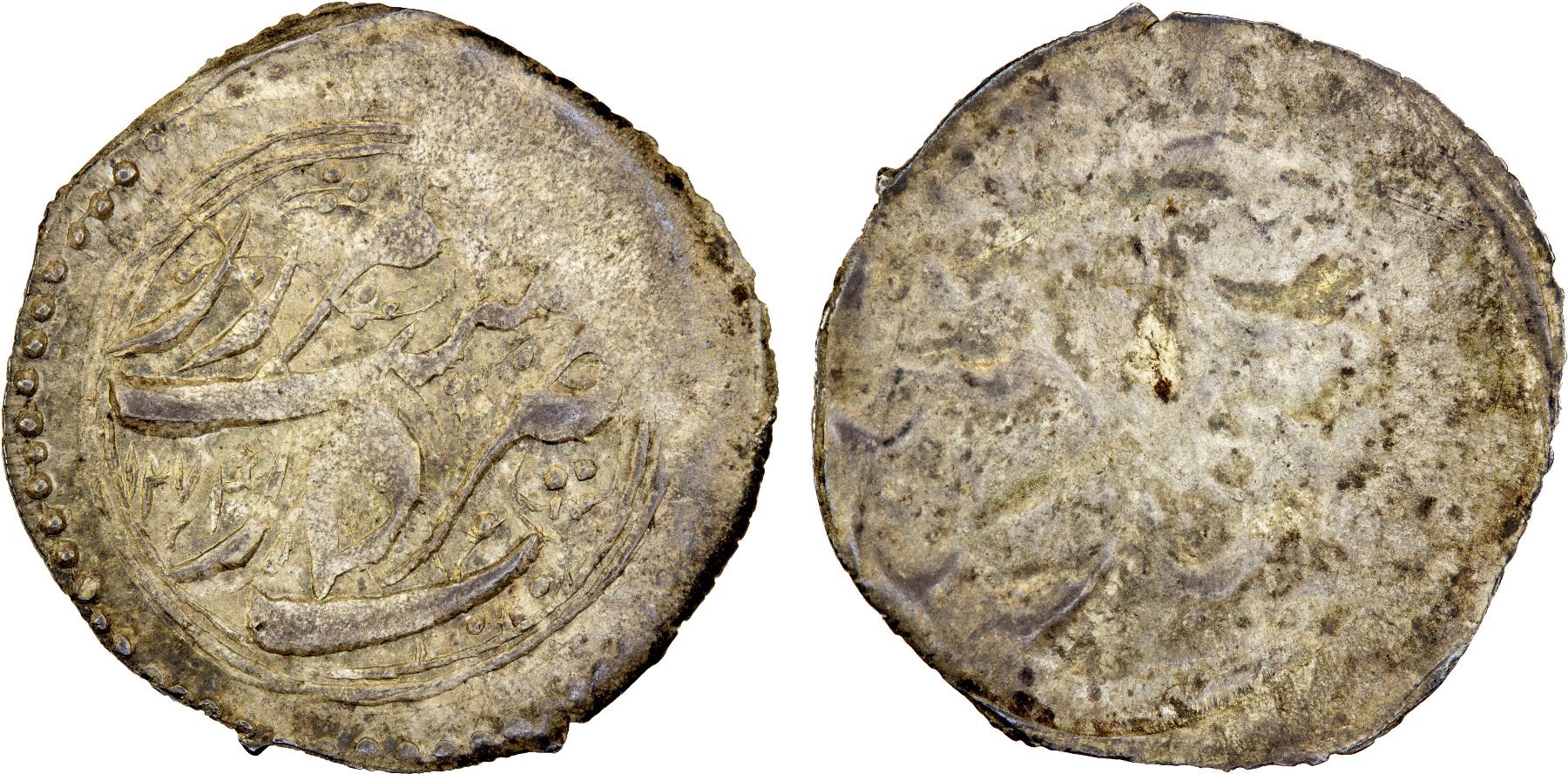 QAJAR: Nasir al-Din Shah, 1848-1896, AR 1/8 qiran (0.65g), Rasht, AH1274, A-2933.2, very rare with fully clear mint & date, traces of the use of a very worn obverse die, EF-AU, RR. These were intended as favors for the New Year (Nowruz) celebration and were known as shahi safid, "white shahi," to distinguish them from the copper shahi.