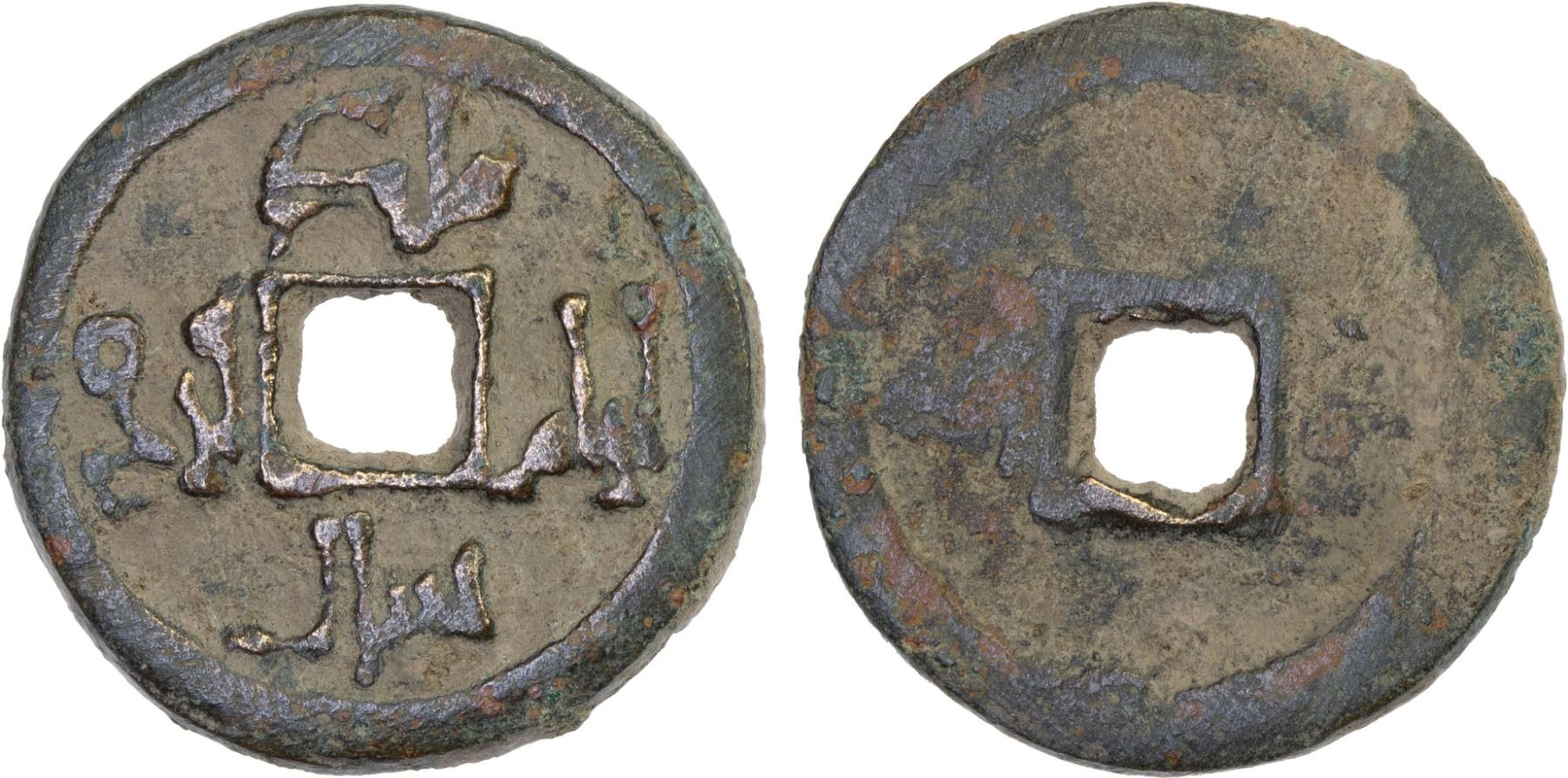 QARA-KHITAY (Western Liao): temp. Yelü Dashi, 1124-1143, AE cash (5.36g), A-3488, ruler cited by the titles malik aram yinal qaraj on the obverse (in late Kufic Arabic), blank reverse; type found between Kyrgyzstan and Xinjiang, bold VF. Yelü Dashi was the first of the Western Liao dynasty of China, known as the Qara-Khitay ("Black Cathay"). This type was called Qarakhanid prototype, A-1510P, before new research.