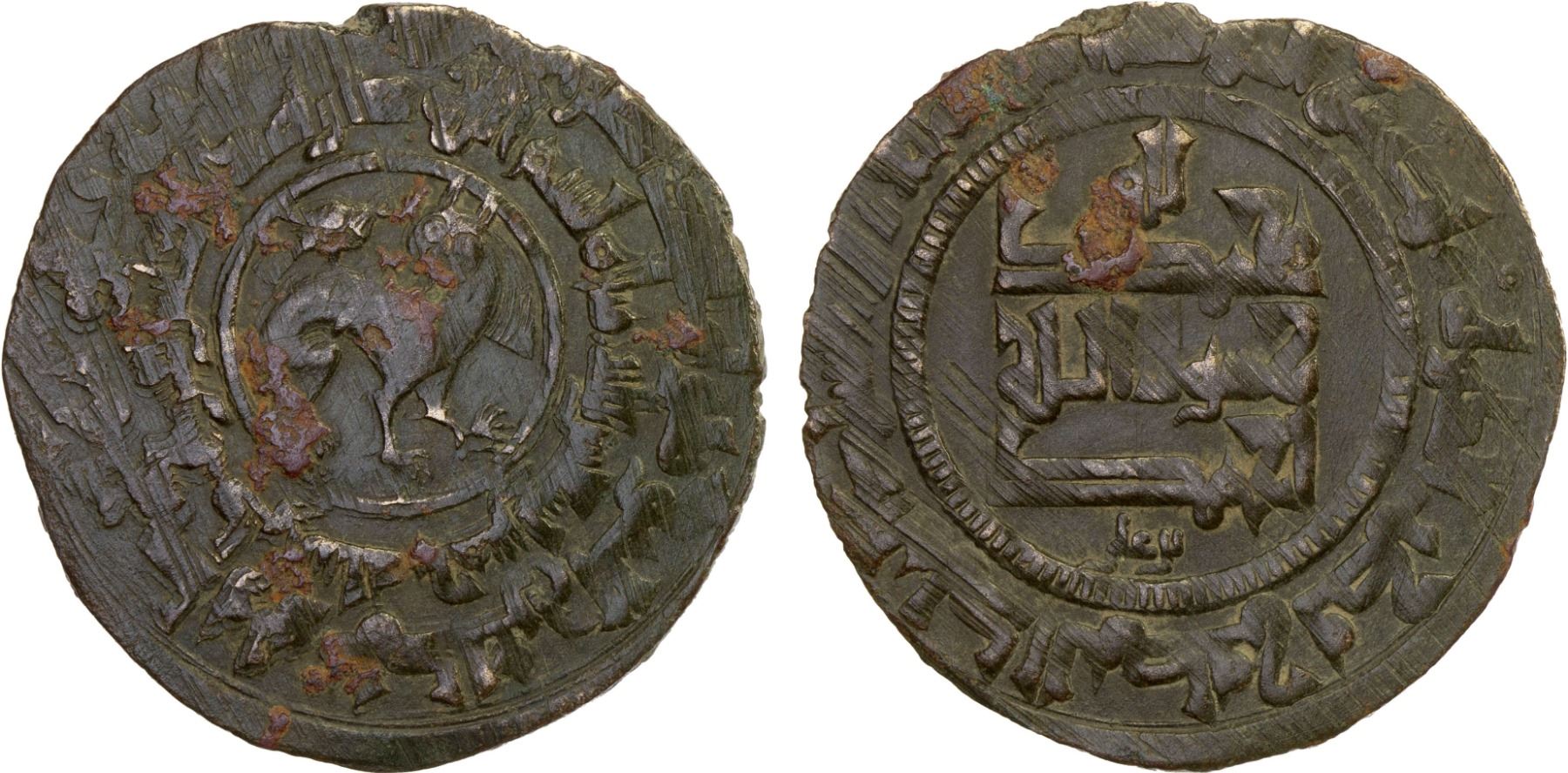 QARAKHANID: Ahmad b. 'Ali, 994-1016, AE fals (3.92g), Quz Urdu, AH395, A-3305, Kochnev-145a, ruler cited as qutb al-dawla wa nasr al-milla, with a bird standing on the back of a lion; bold strike on weight-adjusted planchet, VF-XF, RR.