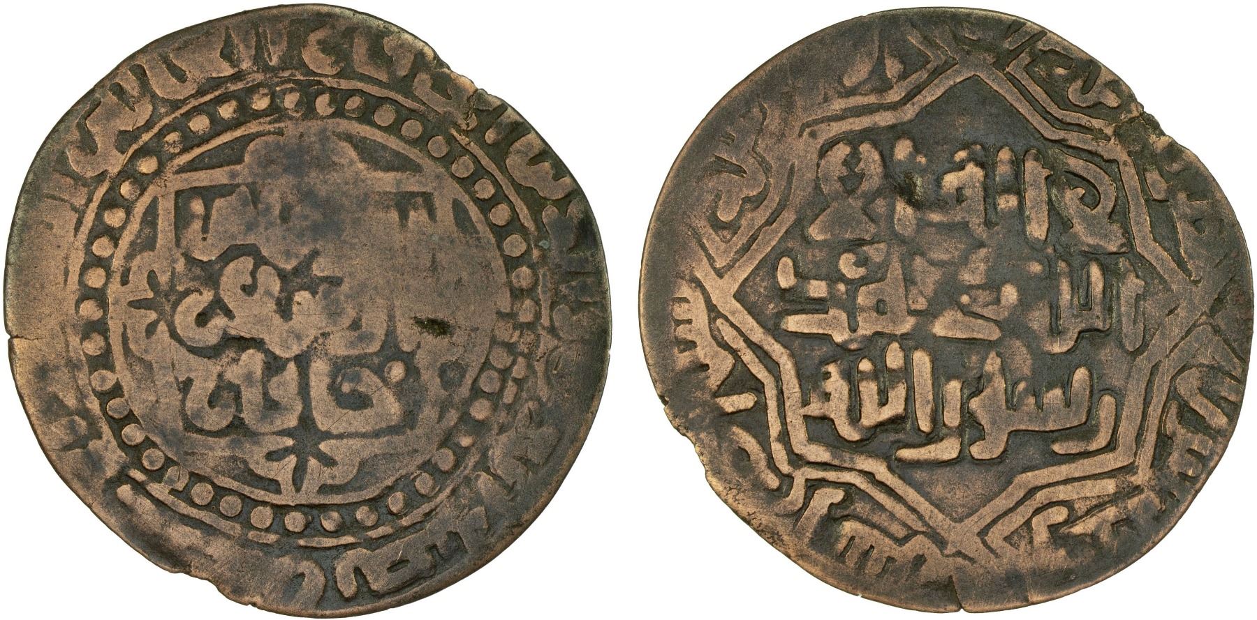 QARAKHANID: Ahmad b. Ibrahim, 1178-1210, AE dirham (3.44g), Uzkand, AH(5)71, A-3416, Zeno-182262 (this piece), Kochnev-1104, ornate design, Fine.