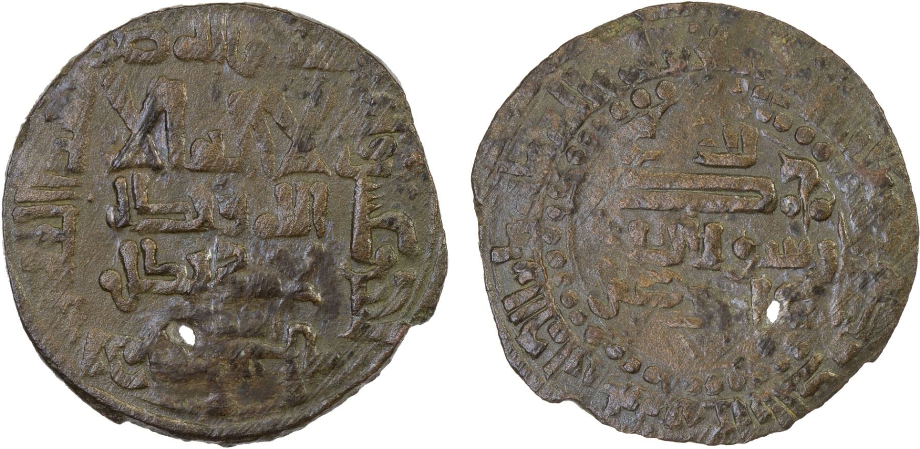 QARAKHANID: 'Ali b. Nasr, fl. 1020, AE fals (3.32g), Khumrak, AH411, A-3328, Kochnev-634, Zeno-120879 & 30438, citing Ilek without name below the obverse, 'Ali b. Nasr in the last line of the reverse field; the date has also been interpreted as 421 (see the discussion on Z-30438); very clear date; some modest porosity, VF, RRR.