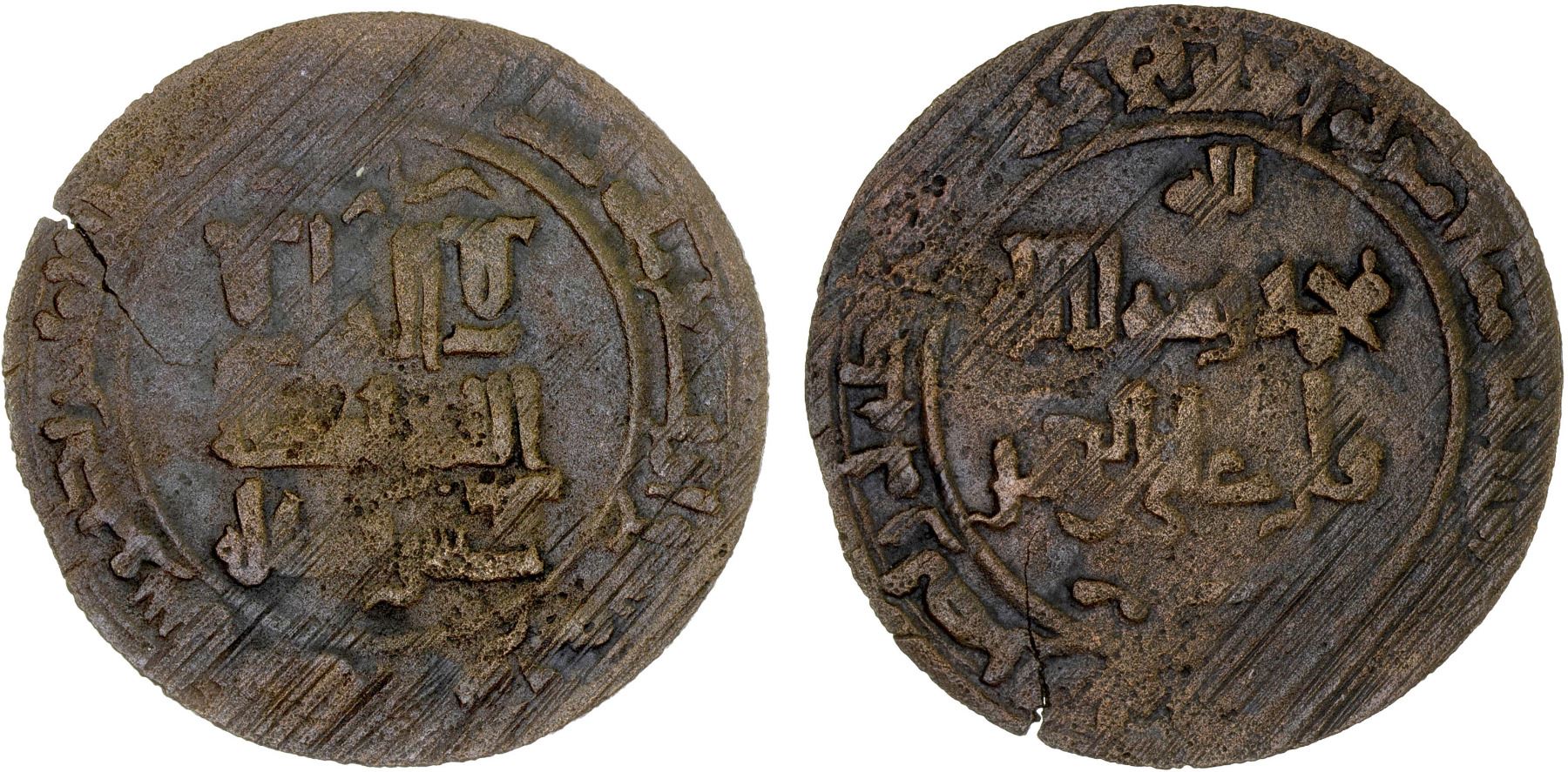 QARAKHANID: 'Ali b. al-Hasan, 1020-1025, AE fals (3.50g), Dabusiya, AH425, A-3348, Kochnev-779, with his laqab qan instead of khan, slight porosity, VF, RR. Dabusiya also used the honorific name Khutlukh Urdu on silver coinage 424-425 and some coppers 425-427.