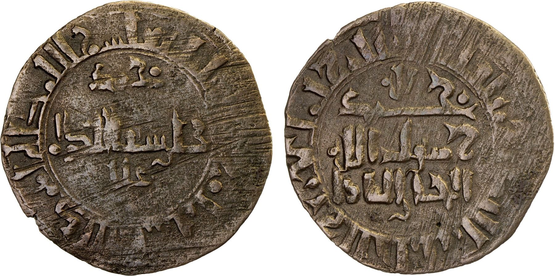 QARAKHANID: Muhammad b. 'Ali, 1003-1024, AE fals (2.02g), Zamin, AH403, A-3308, Kochnev-308, cf. Zeno-15818, citing muhammad / khan sana' al-dawla / `ali // citing Ahmad b. `Ali as al-khan al-`adl in field and Muhammad b. `Ali as yinal tegin in margin, lightly porous, reverse slightly double-struck, an extremely rare mint that is only known for the year 403; minor weakness, slightly weak VF, RRR.