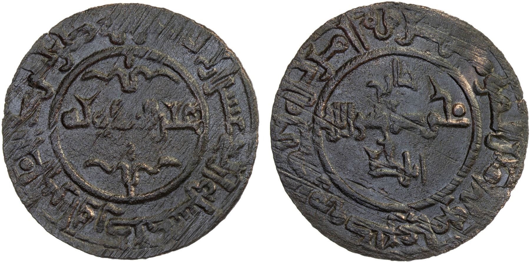QARAKHANID: Muhammad b. Nasr, 1020-1055, AE fals (2.56g), AH414, A-3320, Kochnev-610, Zeno-55649, ruler cited with his laqab 'ayn al-dawla in the obverse center and his personal name muhammad bin nasr in the reverse margin; superb strike, VF-XF, RRR.