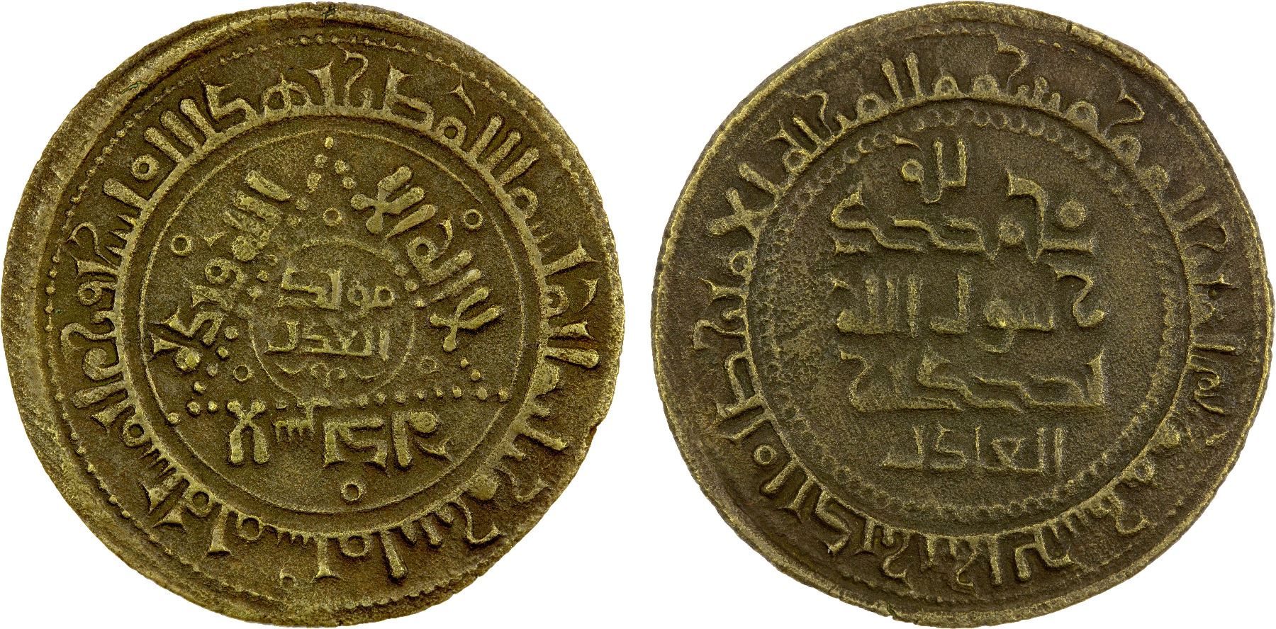QARAKHANID: Nasr b. 'Ali, 993-1012, AE fals (3.81g), Ferghana, AH385, A-3303, Kochnev-25, citing Nasr b. `Ali by his laqab mu'ayyad al-`adl on obverse, tegin al-jalil in reverse field (g elongated and interwoven), and al-amir tungha tegin abi al-Hasan, excellent strike, cleaned, choice VF, S, ex Ralph A Cannito Collection.