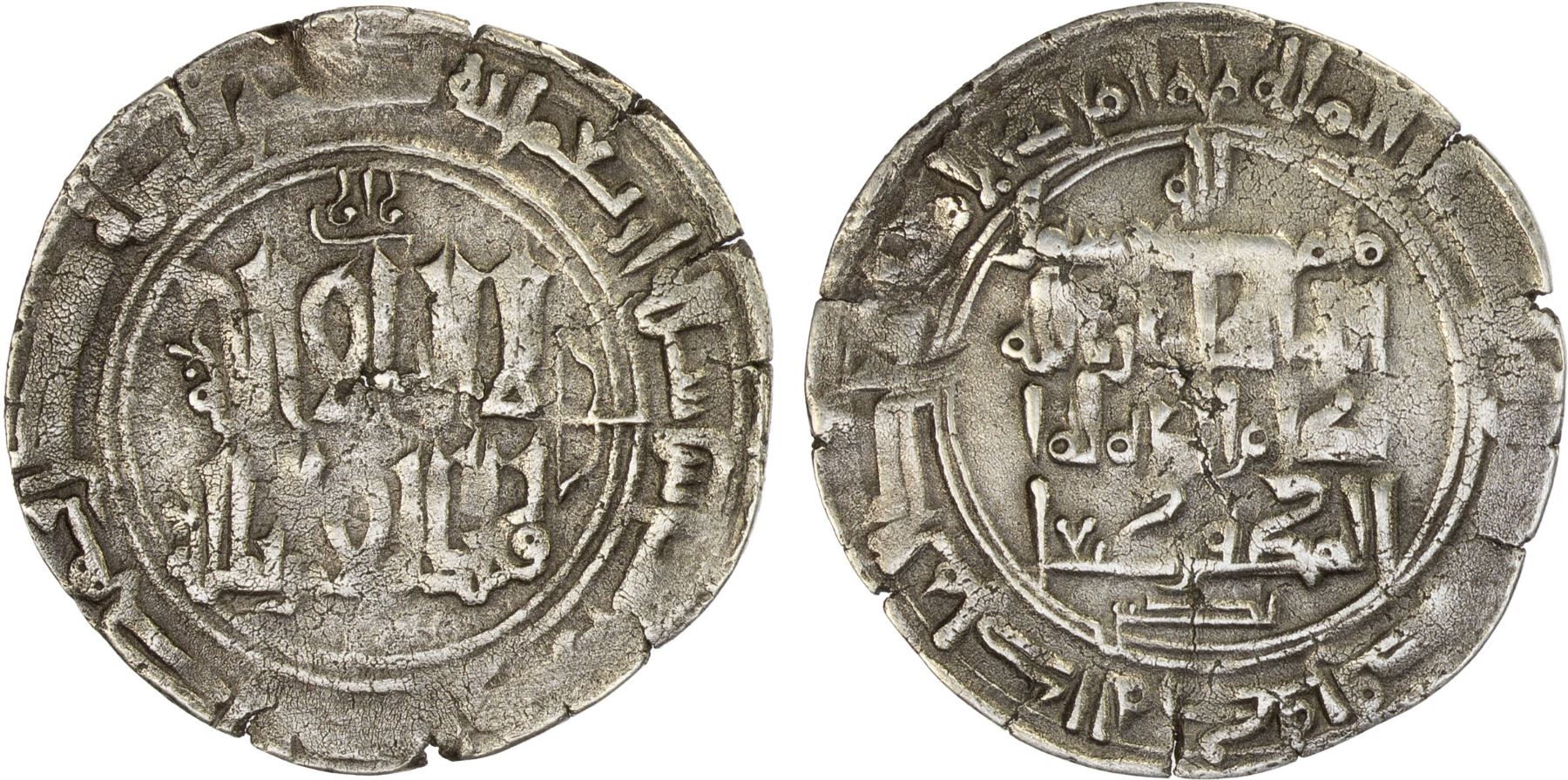 QARAKHANID: Nizam al-Dawla Tungha-tegin, 1009-1014, AR dirham (2.52g), al-Shash, AH400, A-3333, Kochnev-260-var, Zeno-16262, citing the overlord Ahmad b. 'Ali as qutb al-dawla wa nasr al-milla and the word râzi above the obverse, perhaps the name of a local official; extremely rare type with a bow and arrow added at the right of the obverse field, VF, RRR.