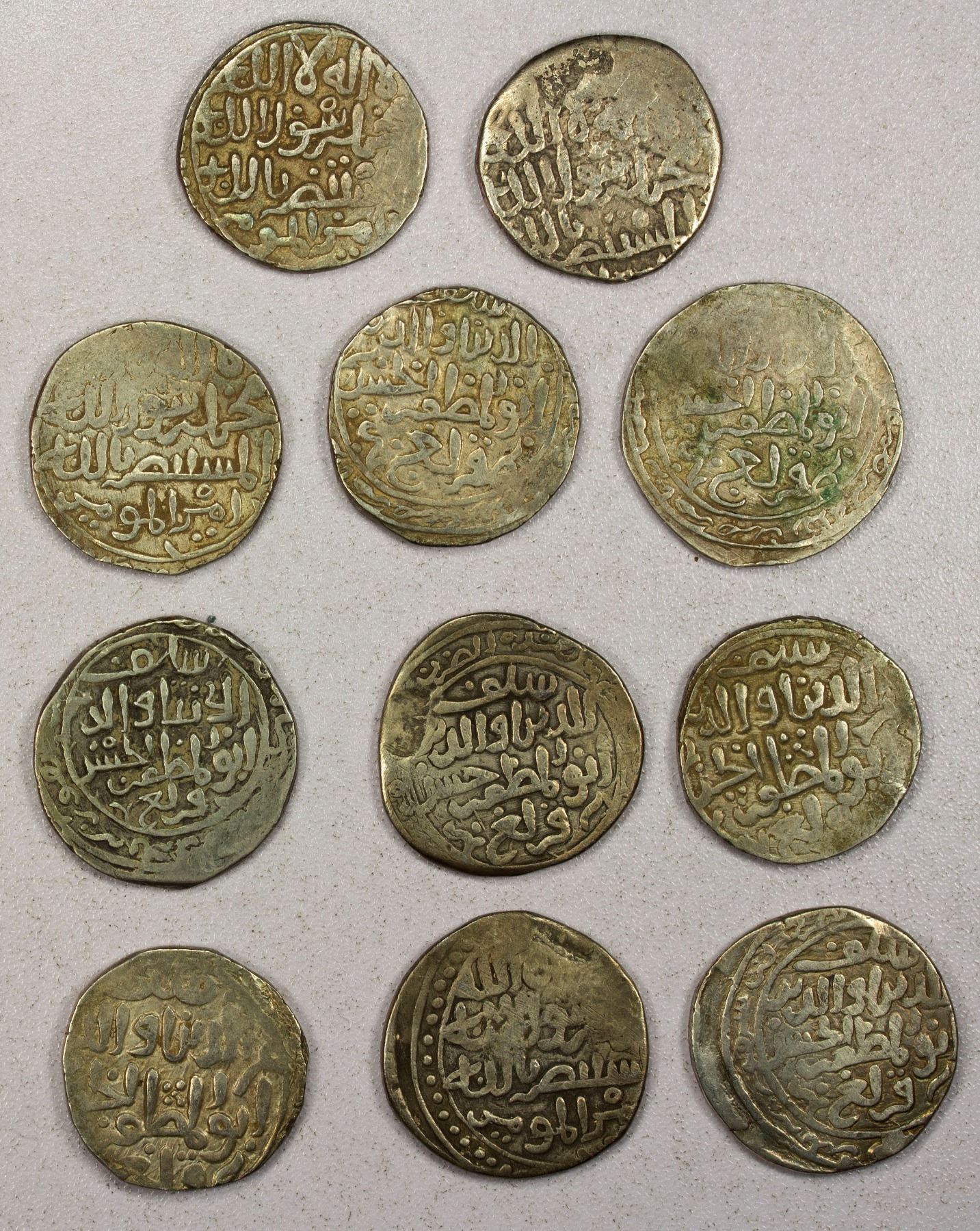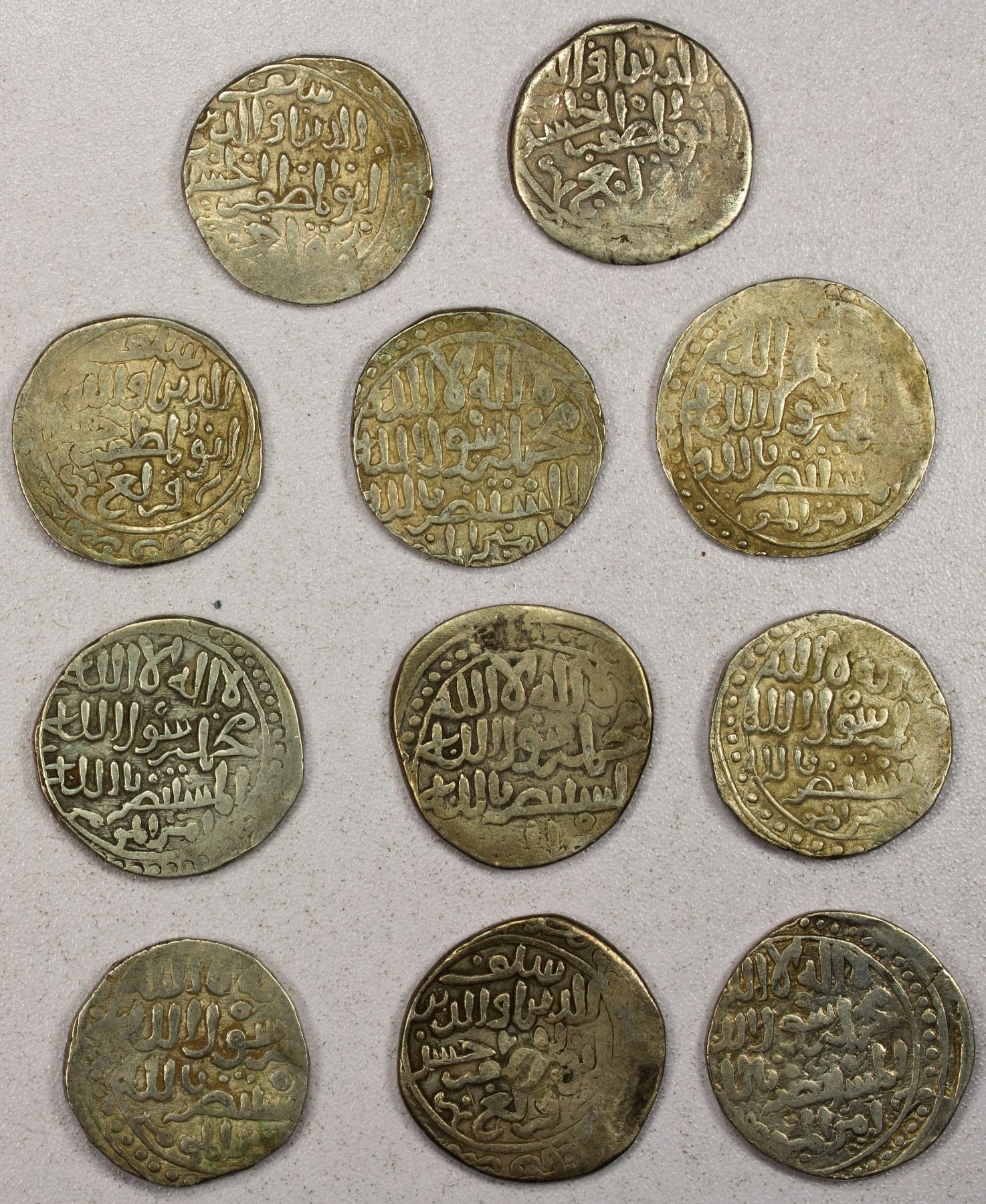 QARLUGHID: al-Hasan Qarlugh, 1224-1249, LOT of 11 silver tankas, Type A-1813.2, average weight about 10.9g, all with date off flan; average nearly VF condition, two with mount removed and several others with weakness or other flaws; retail value $500, lot of 11 pieces.