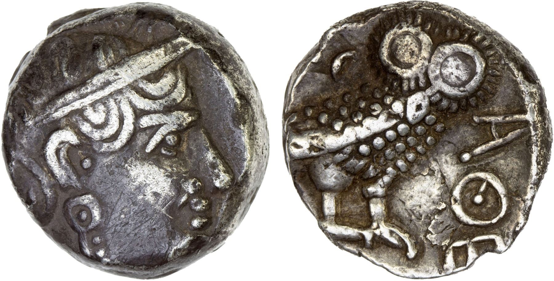 QATABAN: Anonymous, AR tetradrachm (16.35g), ca. 4th century BC, Huth-326-28, imitating Athenian issue, helmeted head of Athena right // owl standing right with head facing, crescent to left, AΘE (theta with dash instead of dot) to right, small graffito on cheek, VF.