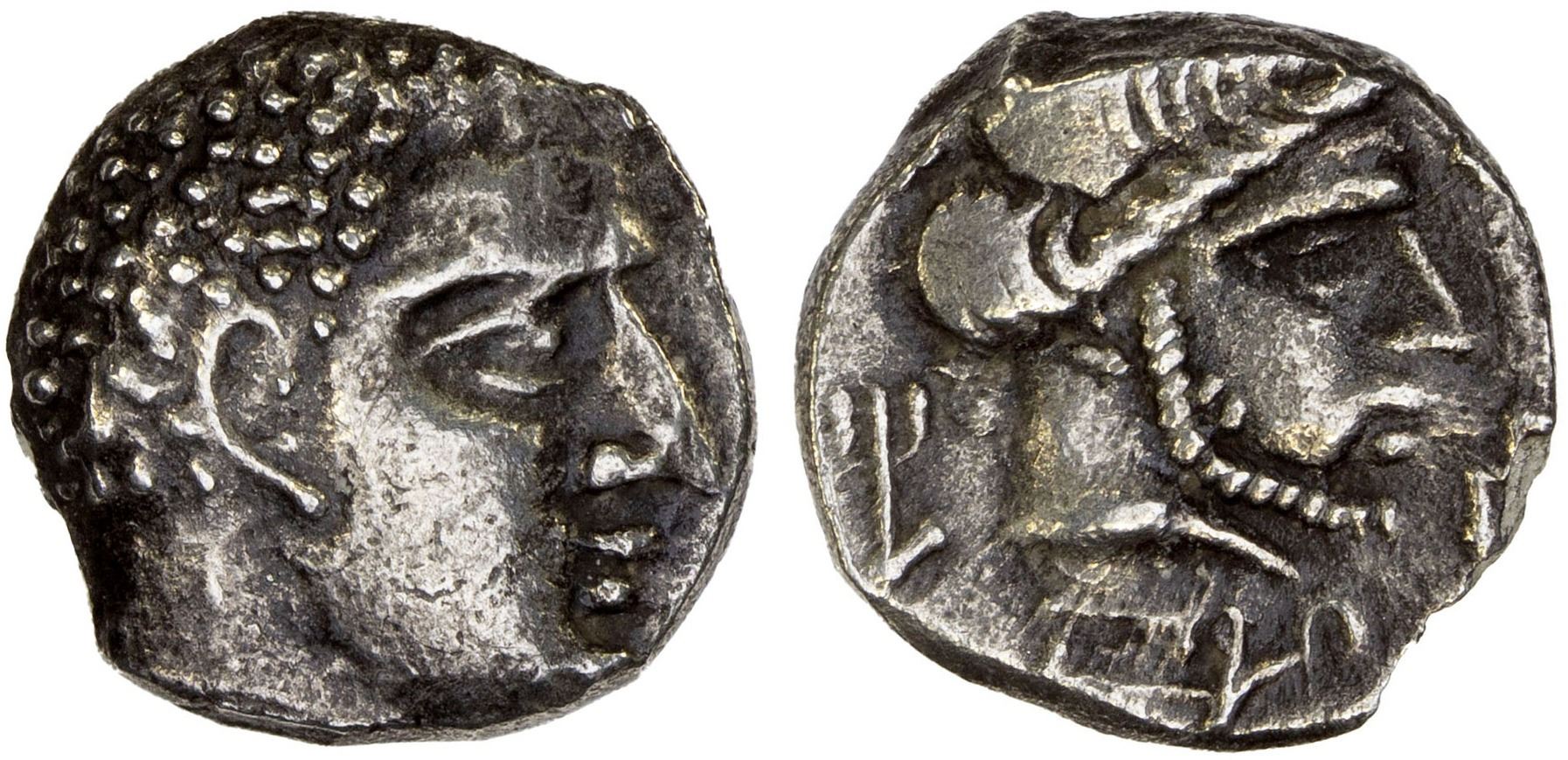 QATABAN: Uncertain Ruler, AR hemidrachm (1.78g), ca. 2nd century BC, cf. Huth-363, male head right // bearded male head right, monogram below, royal monogram to left, another monogram to right, VF.
