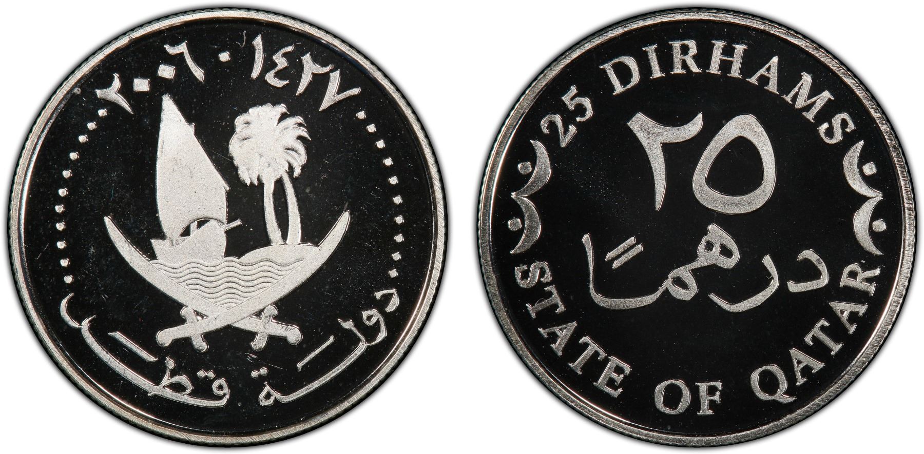 QATAR: Hamad b. Khalifa al-Thani, 1995-2013, AR 25 dirhams, 2006/AH1427, KM-14a, off-metal strike in silver, struck at the Austrian State Mint, PCGS graded PF69 Deep Cameo.