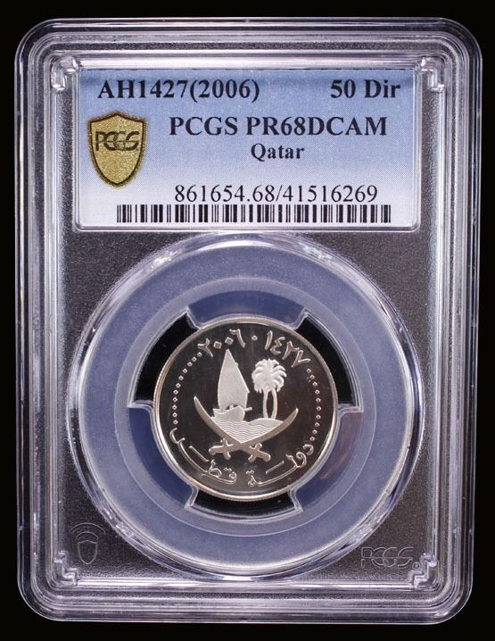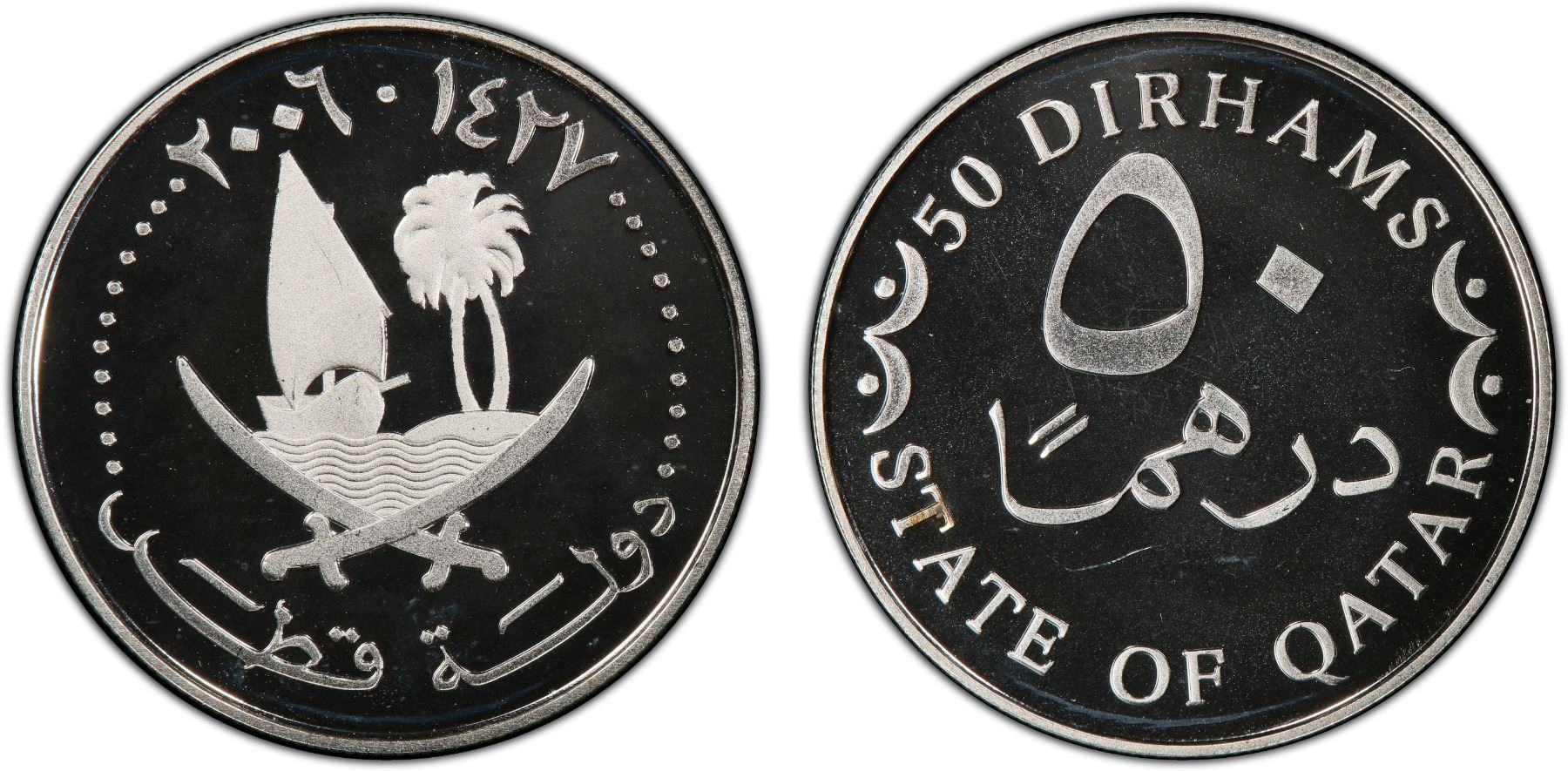 QATAR: Hamad b. Khalifa al-Thani, 1995-2013, AR 50 dirhams, 2006/AH1427, PCGS PF68 Deep Cameo
