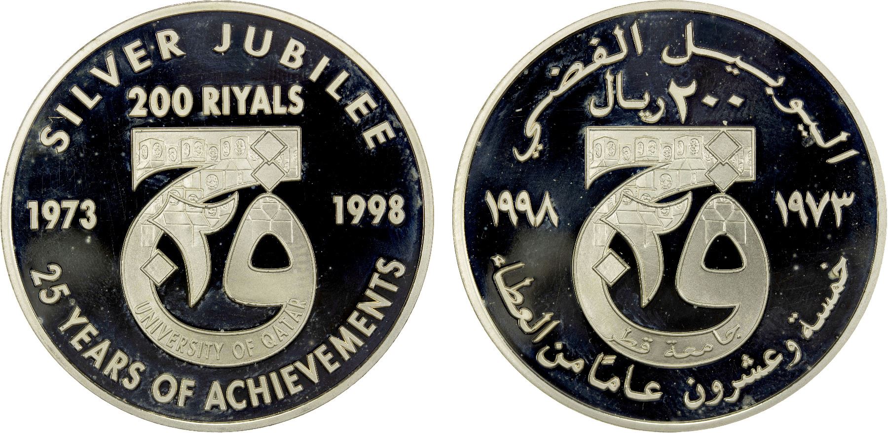 QATAR: State, AR 200 riyals, 1998, KM-10, 25th Anniversary of Qatar University, mintage of only 1,000 pieces, Proof, R, ex Wolfgang Schuster Collection.