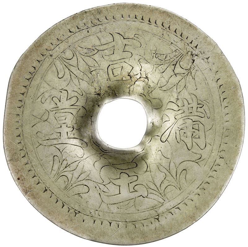 QING: AR charm (22.29g), hand-engraved, with Chinese inscription that means "hall full of jade, good luck" on floral background, hand punched central hole (as made), VF.
