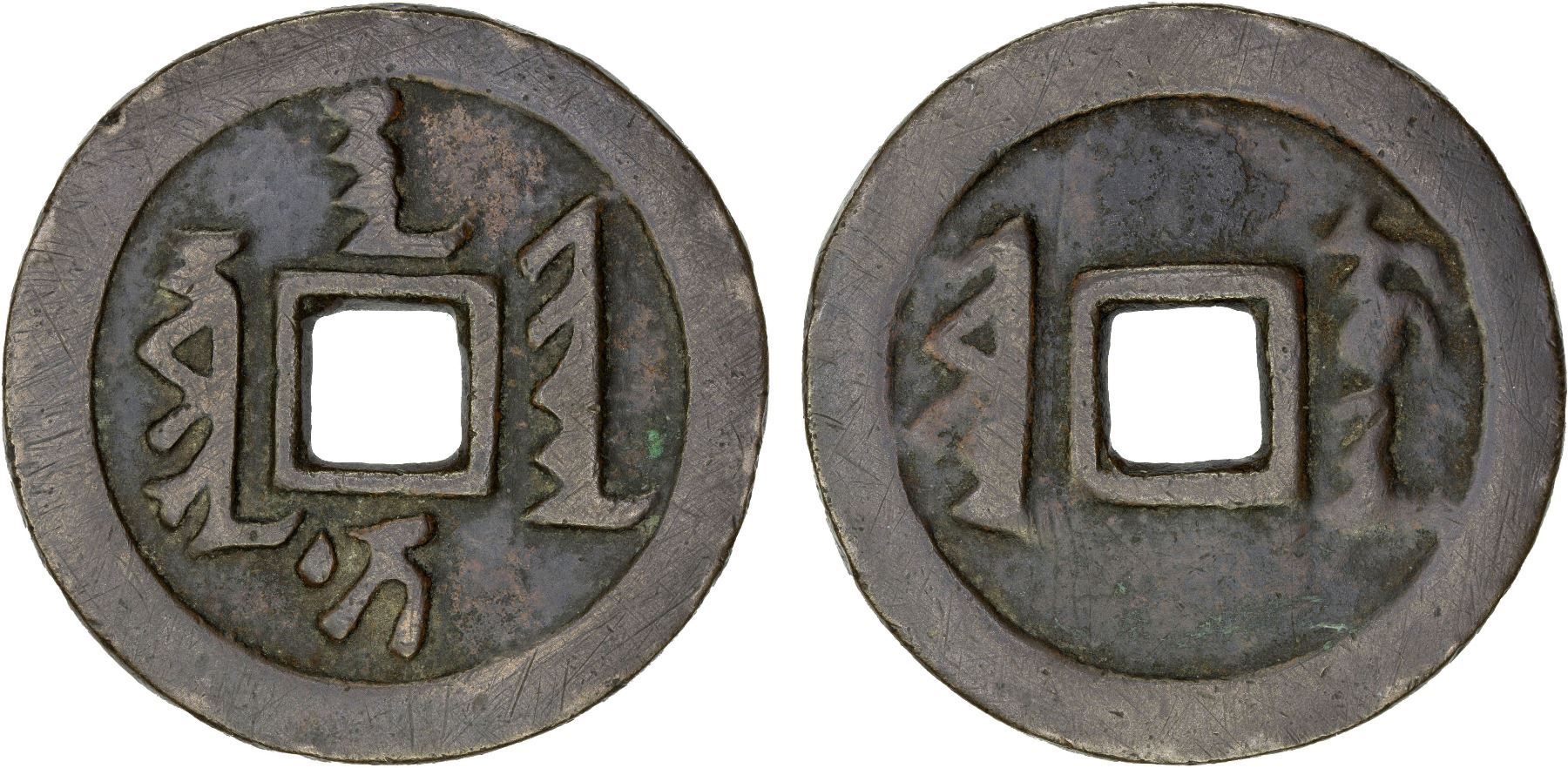 QING: Abahai, 1627-1643, AE 10 cash (26.1g), H-22.8, 43mm, sure han ni jiha in Manchurian script, on reverse juwan (ten [cash]) at left, emu yan (one liang [of silver]) at right, graded 72 by GBCA Grading Company, VF, ex Dr. Dirk Löer Collection.