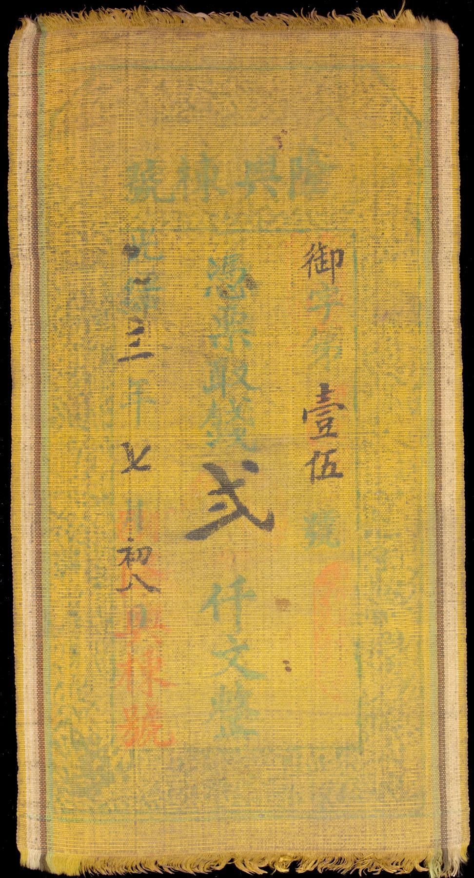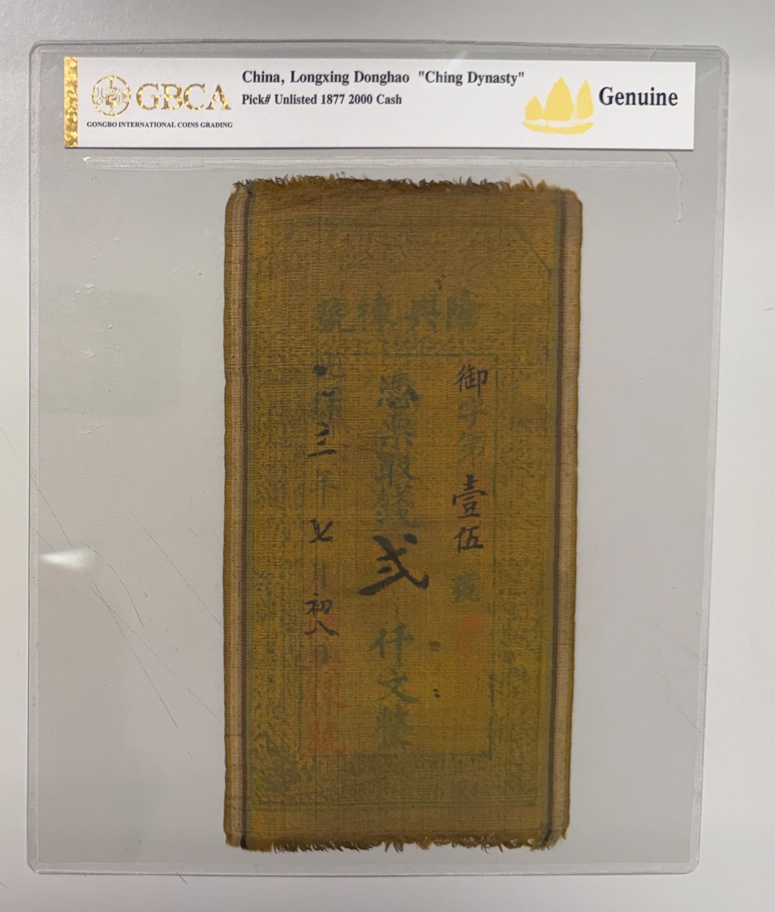 QING: Kuang Hsu, 1875-1908, 2000 cash, year 3 (1877), Private bank issue, Long Xing Dong Hao Bank, printed on cloth or silk, graded 'Genuine' by GBCA Grading Company, Fine, ex Spink Auction CSS21, "The Numismatic Collector's Series Sale", Lot 636 (part).