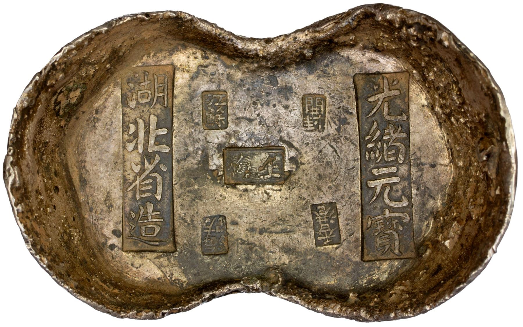 QING: Kuang Hsu, 1875-1908, AR 50 tael (liang) sycee (1868.2g), cf. BMX Class XIV A-102, large silver Hubei Yuanbao Principal Ingot type, stamped guang xu yuan bao (Guangzu Period [1875-1908] ingot) at right, hu bei sheng zao (Made in Hubei Province) at left, shang hai (Shanghai) at center with four additional small stamps: Jiangsu, Kaifeng, Hong Kong, and Hai Phong, GBCA graded AU58, ex Dr. Dirk Löer Collection.