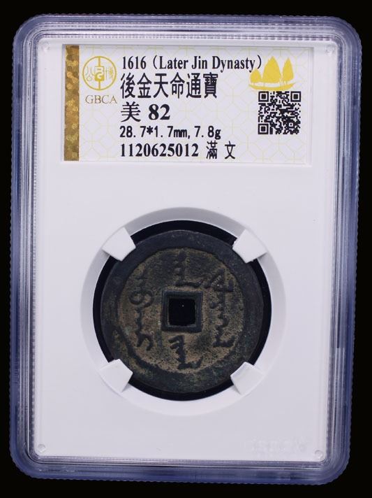 QING: Nurhaci, 1616-1626, AE cash (7.8g), H-22.2, abkai fulingga han jiha in Manchu script, graded 82 by GBCA Grading Company, VF-XF, ex Bernd Löer Collection. In 1616, Nurhaci (Tian Ming) declared himself Khan (King) and founded the Later Jin Dynasty. He constructed a palace at Mukden (Shenyang) in Liaoning province. The Later Jin Dynasty was renamed Qing by his son Hong Taiji after his death in 1626, but Nurhaci is traditionally referred to as the founder of the Qing Dynasty.