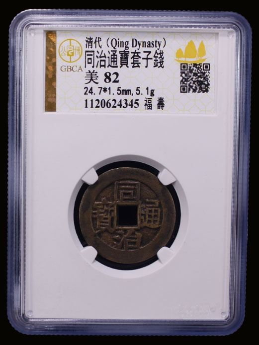 QING: Tong Zhi, 1862-1874, AE charm (5.1g), fu shou ("happiness and longevity") in seal script, graded 82 by GBCA Grading Company, VF. So-called "Birthday Cash" made to give out on special occasions and important birthdays. In our opinion, this was likely cast during the Guangxu period, 1875-1908.