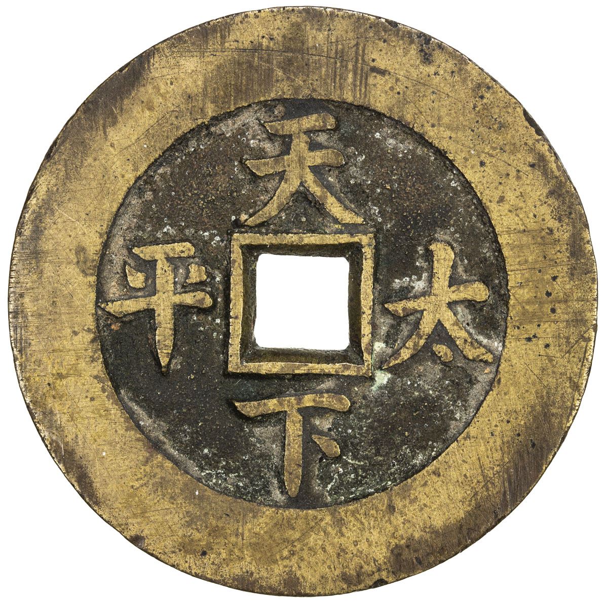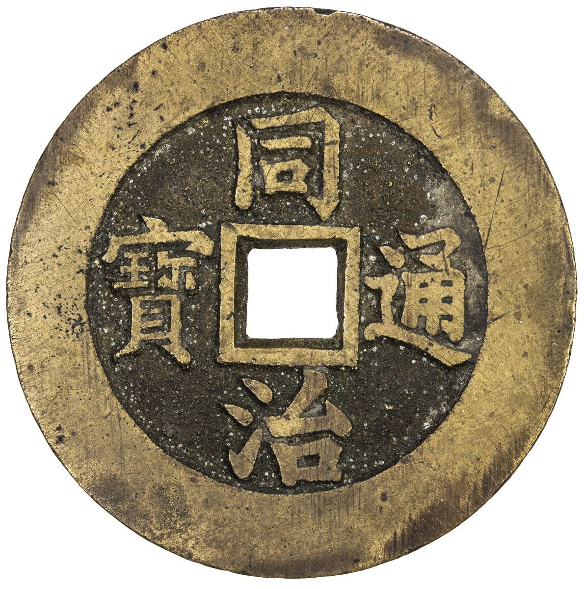 QING: Tong Zhi, 1862-1874, AE palace cash (28.39g), Board of Revenue mint, Peking, H-26.3, 43mm, "curtain-hanging money", tian xia tai ping (heaven below great peace), EF. Palace cash may or may not be considered a type of amulet. These were made as New Year's gifts to people in the Imperial Palace, usually eunuchs and guards, who often hung the smaller ones below lamps and the larger ones below curtains. Hartill, in "Qing Cash" (Royal Numismatic Society, 2003), agrees they were handed out as gifts in the Palace, but only upon the establishment of each new reign title, and were wrapped in red cloth.