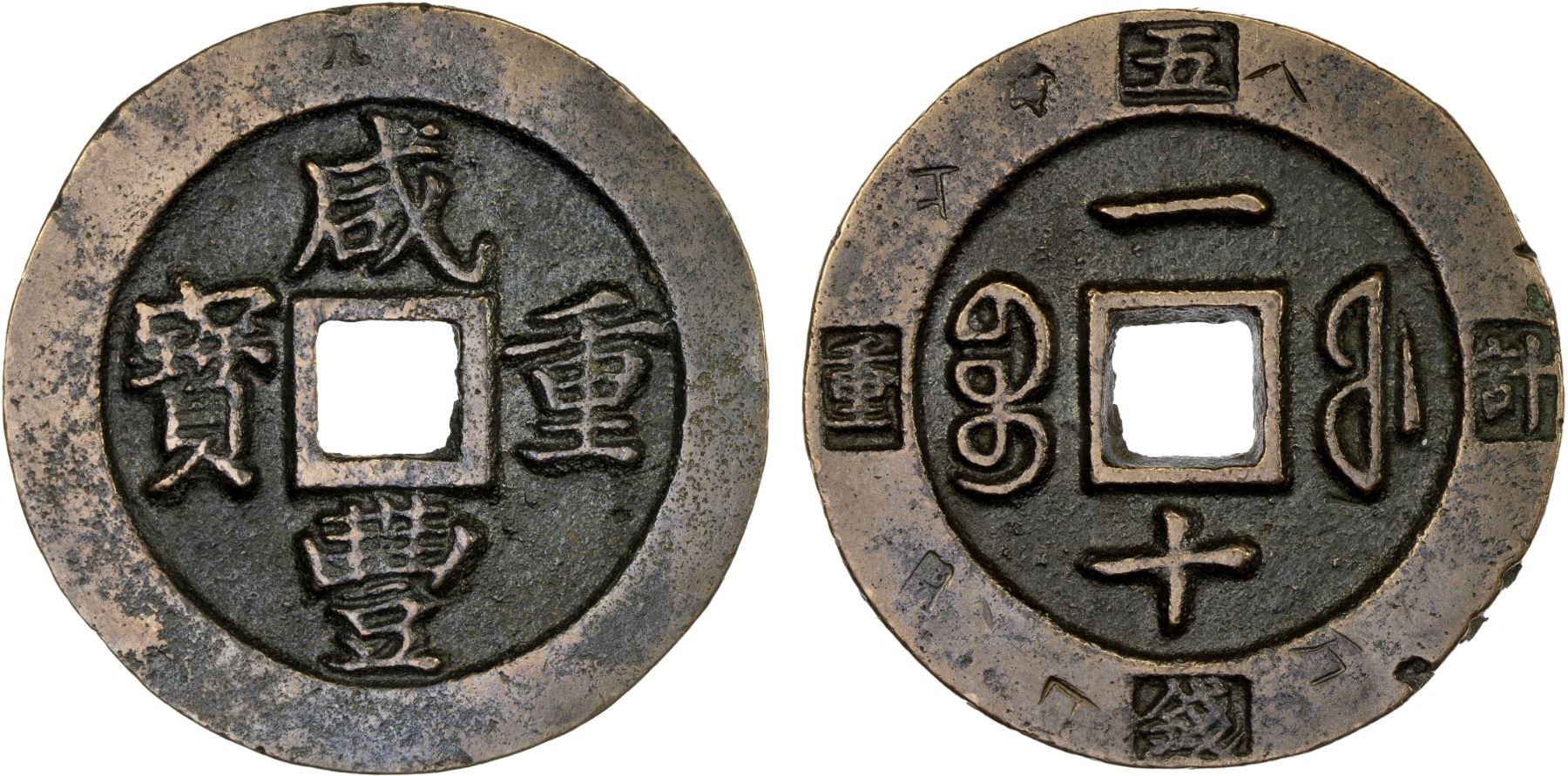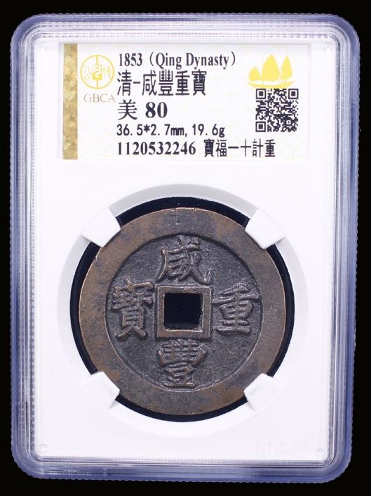 QING: Xian Feng, 1851-1861, AE 10 cash (19.6g), Fuzhou Mint, Fujian Province, H-22.793, wu qian ji zhong incuse on reverse rim, cast 1853-55, graded 80 by GBCA Grading Company, several Chinese merchant chopmarks on reverse rim, VF.