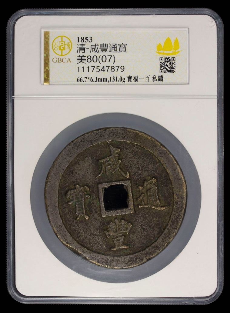 QING: Xian Feng, 1851-1861, AE 100 cash (131g), Fuzhou Mint, Fujian Province, H-22.784, 66mm, one dot tong, brass (huang tong) color, contemporary private issue, small casting flaw on obverse rim at 7h, graded 80(07, casting defect) by GBCA Grading Company, holder with a few faint spots of residue on reverse and a couple chips on edges, Choice VF.