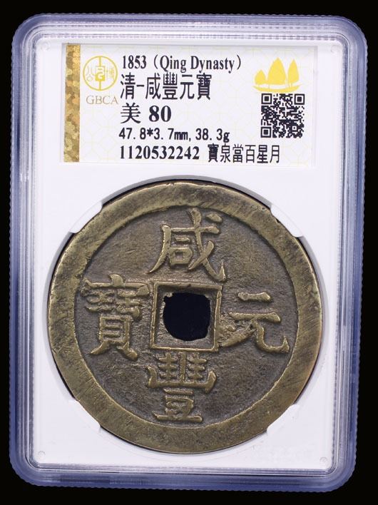 QING: Xian Feng, 1851-1861, AE 100 cash (38.36g), Board of Revenue Mint, Beijing, H-22.717, 48mm, Prince Qing Hui Mint, 'sun & moon' above, cast May-August 1854, graded 80 by GBCA Grading Company, VF.