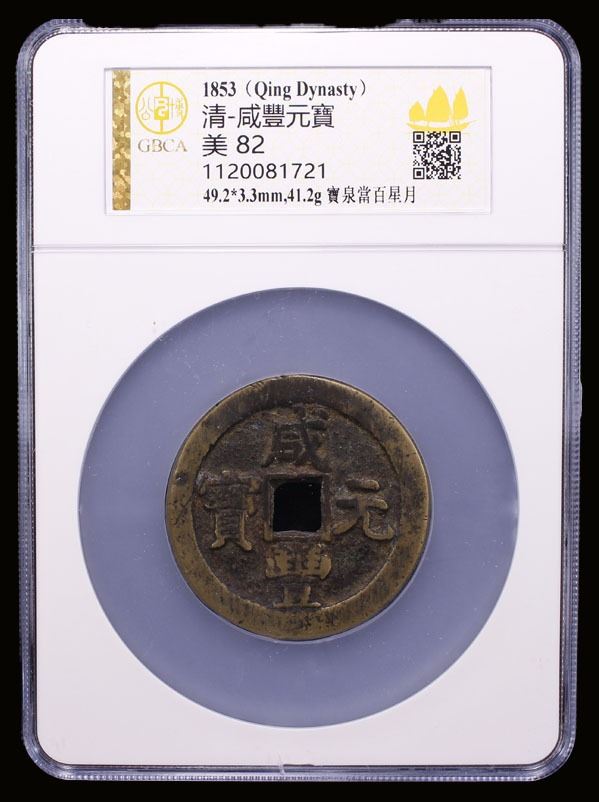 QING: Xian Feng, 1851-1861, AE 100 cash (41.2g), Board of Revenue Mint, Beijing, H-22.717, 49mm, Prince Qing Hui Mint, 'sun & moon' above, cast May-August 1854, graded 82 by GBCA Grading Company, VF.