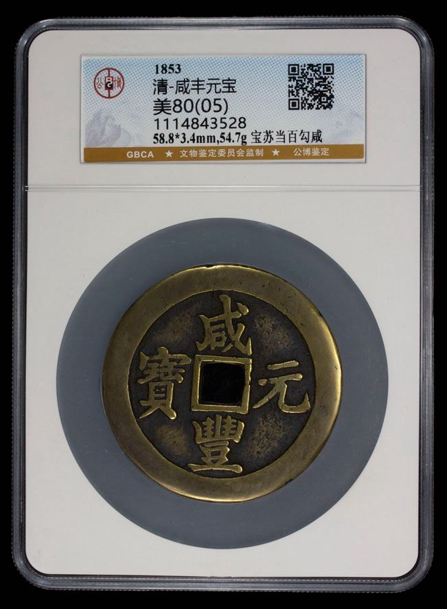 QING: Xian Feng, 1851-1861, AE 100 cash (54.7g), Jiangsu Province, H-22.914, 59mm, variety with hooked xian and left-protruding bao, cast 1854-55, graded 80(05, natural casting crack) by GBCA Grading Company, VF.
