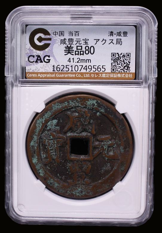 QING: Xian Feng, 1851-1861, AE 100 cash, Aksu Mint, Xinjiang Province, H-22.1078, 41mm, cast 1854-1859, large bao variety, "red cash" (hóng qián) issue, graded 80 by CAG Grading Company, VF.