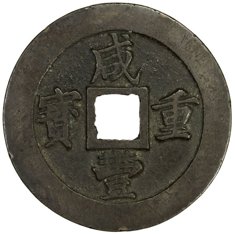 QING: Xian Feng, 1851-1861, AE 20 cash, Fuzhou mint, Fujian Province, H-22.794, 48mm, yi liang ji zhong incuse on rim, cast 1853-55, copper (tóng) color, VF to EF, ex Jiùjinshan Collection.