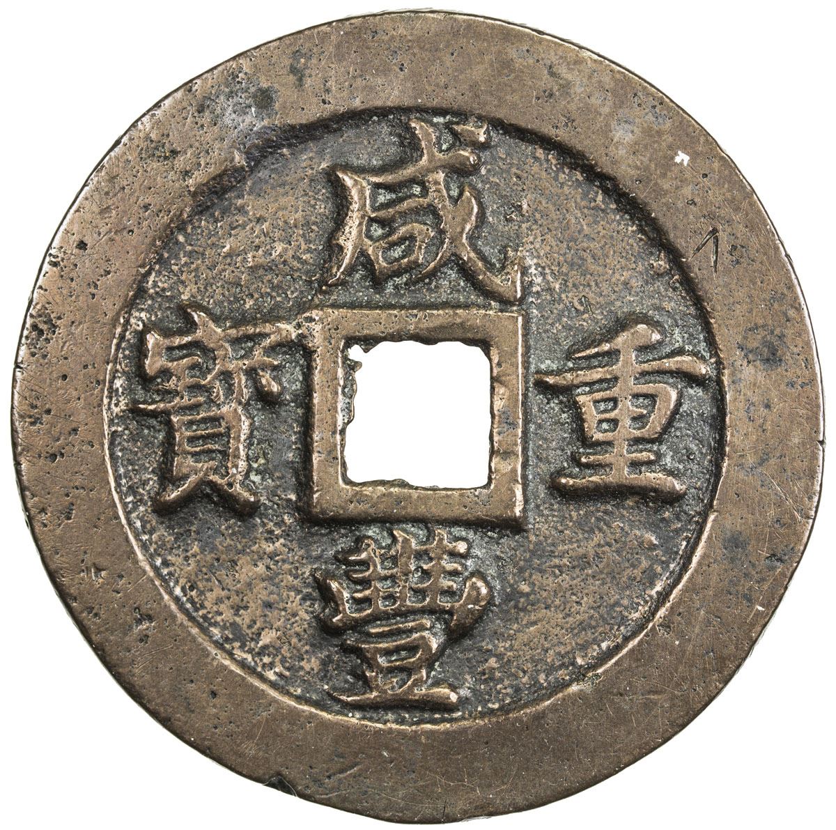 QING: Xian Feng, 1851-1861, AE 50 cash, Fuzhou mint, Fujian Province, H-22.795, 58mm, er liang wu qian (two tael, five mace) incuse around rim, cast 1853-55, copper (tóng) color, lightly cleaned, several small chopmarks on rims, still a lovely example, VF-EF.