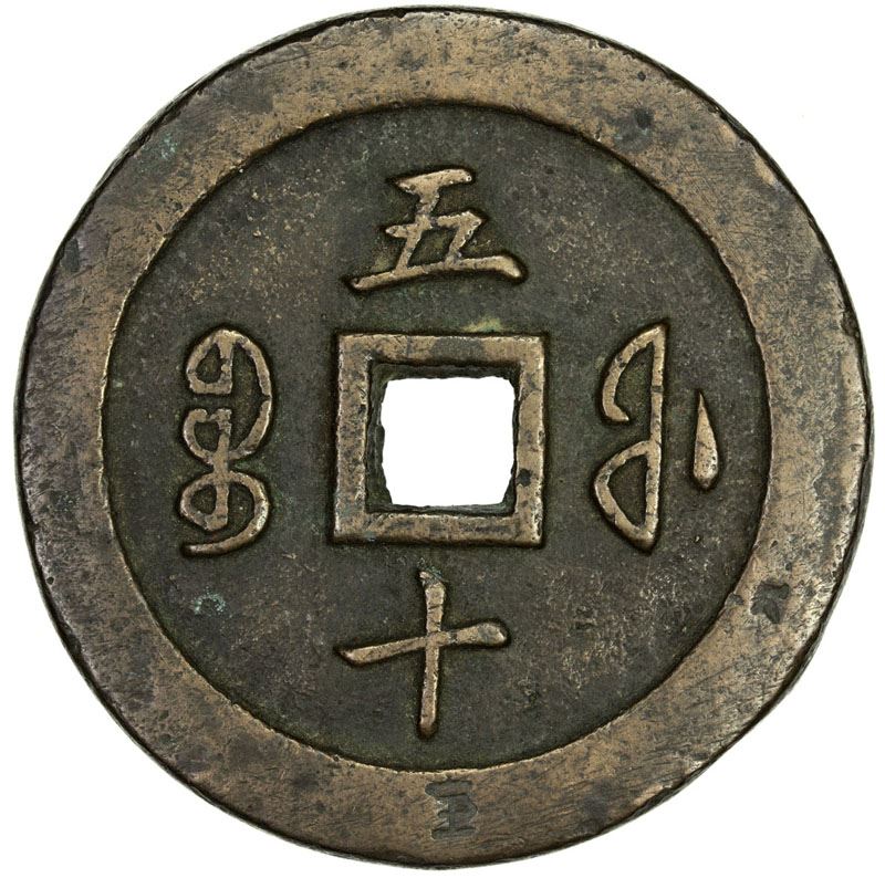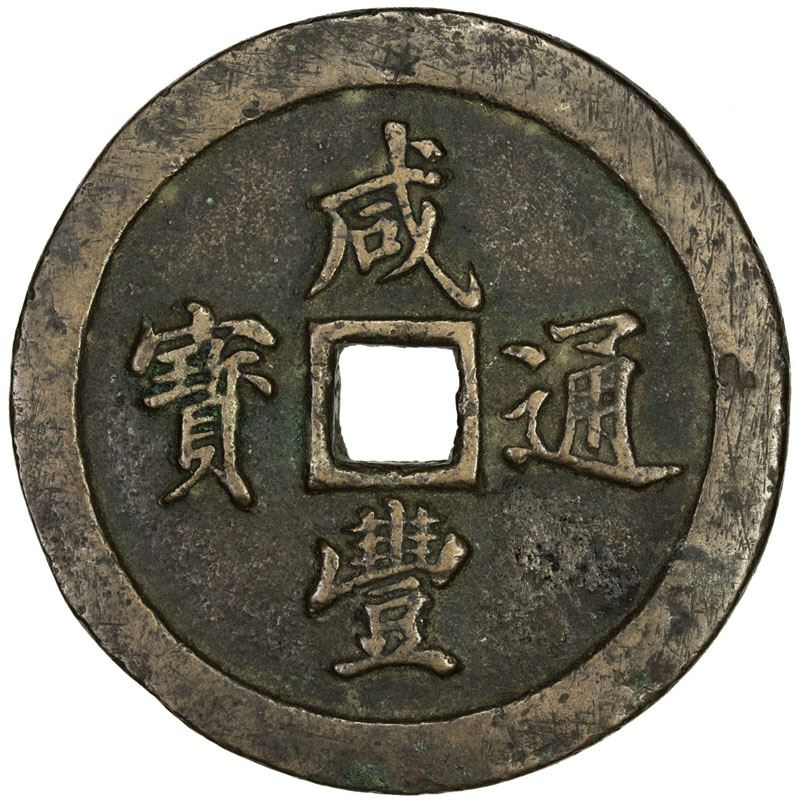 QING: Xian Feng, 1851-1861, AE 50 cash, Fuzhou mint, Fujian Province, H-22.782, 57mm, cast 1853-55, copper (tóng) color, two chopmarks on reverse rim, another on obverse rim, VF, ex Jiùjinshan Collection.