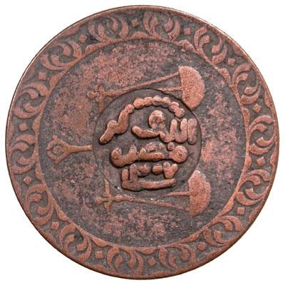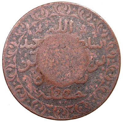 QU'AITI STATE OF SHIHR & MUKALLA: Awadh ibn 'Umar, as Hakim, 1881-1902, AE ¼ anna, AH1307, KM-10, Arabic text and date in a small 10 mm circular indent on a Zanzibar pysa AH1299, thick text, Very Fine on f-vf host. Considered a spurious issue.