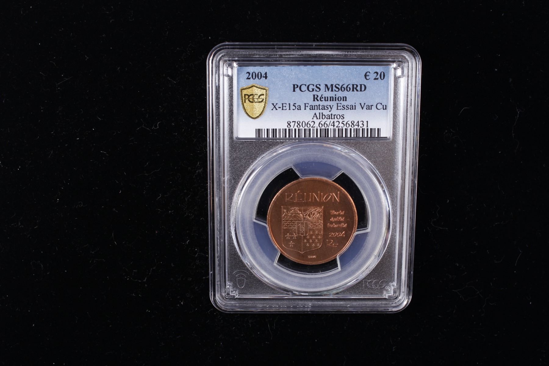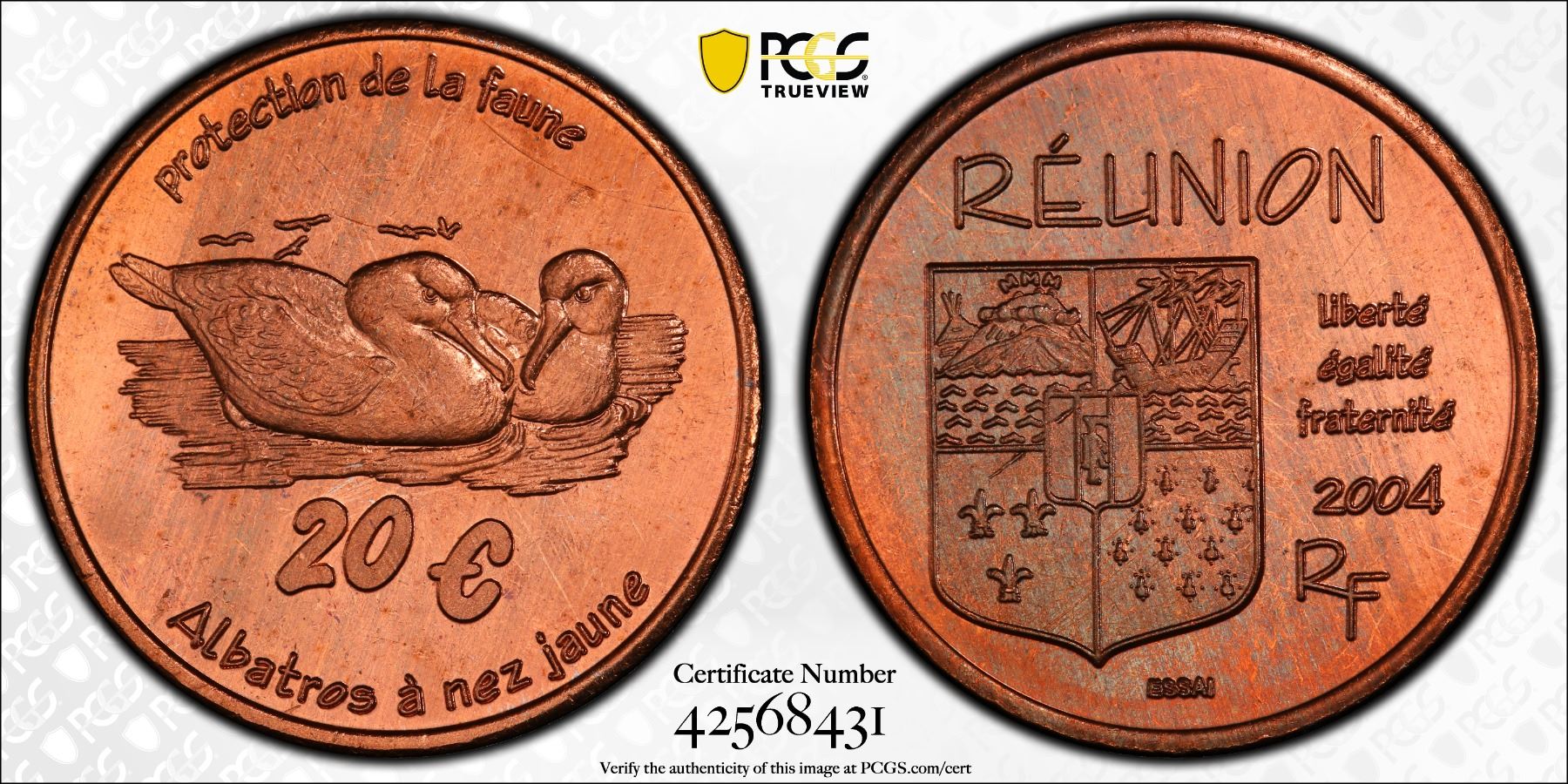 RÉUNION: Fantasy Issues, AE 20 euro, 2004, KM-XE15a, Wildlife Conservation Series - Atlantic Yellow-Nosed Albatross, fantasy pattern essai in pure copper, mintage of only 30 pieces, very rare, PCGS graded MS66 RD. Private pattern struck at the Patrick Mint. The mint began operating in 1972 and was known for striking mainly tokens until the mint was destroyed in the 2017 Tubbs Fire in the "Northern California Firestorm" along with 5,642 other structures in Santa Rosa, California.