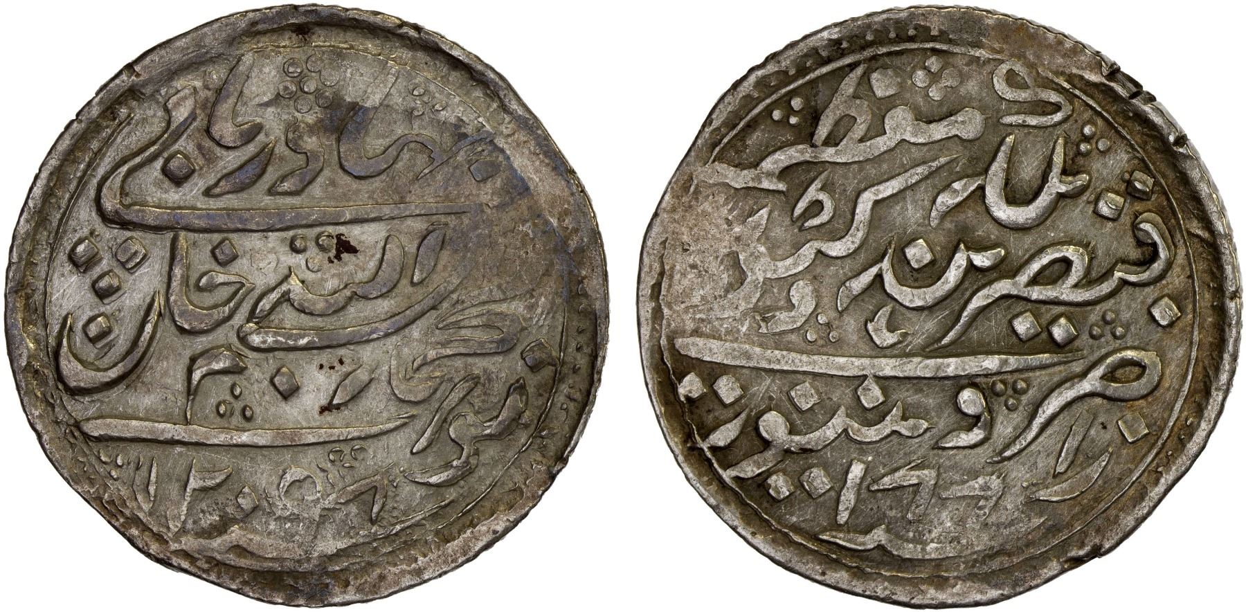 RADHANPUR: Bismilla Khan, 1874-1895, AR rupee (10.97g), Radhanpur, "188" (for 1880)//AH1298, KM-27, also citing Queen Victoria on the reverse; slight weakness, but actually above-average strike for this type, choice XF, R.