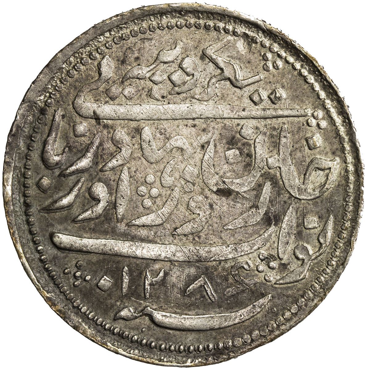 RADHANPUR: Zorawar Khan, 1825-1874, AR rupee (11.74g), Radhanpur, 1870//AH1286, KM-11, very rare date combination, 1870 normally matched with AH1287, whereas AH1286 is paired with 1869, slight central weakness of strike, nonetheless fully legible, appears to be unpublished, EF, RR.