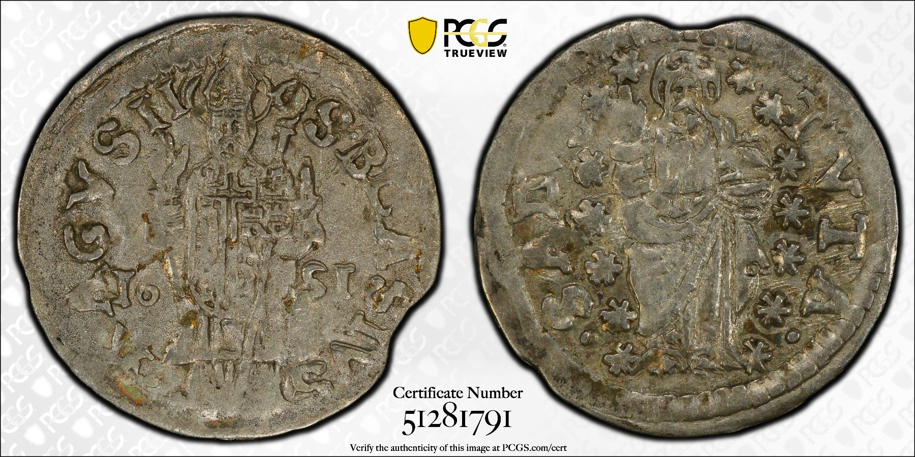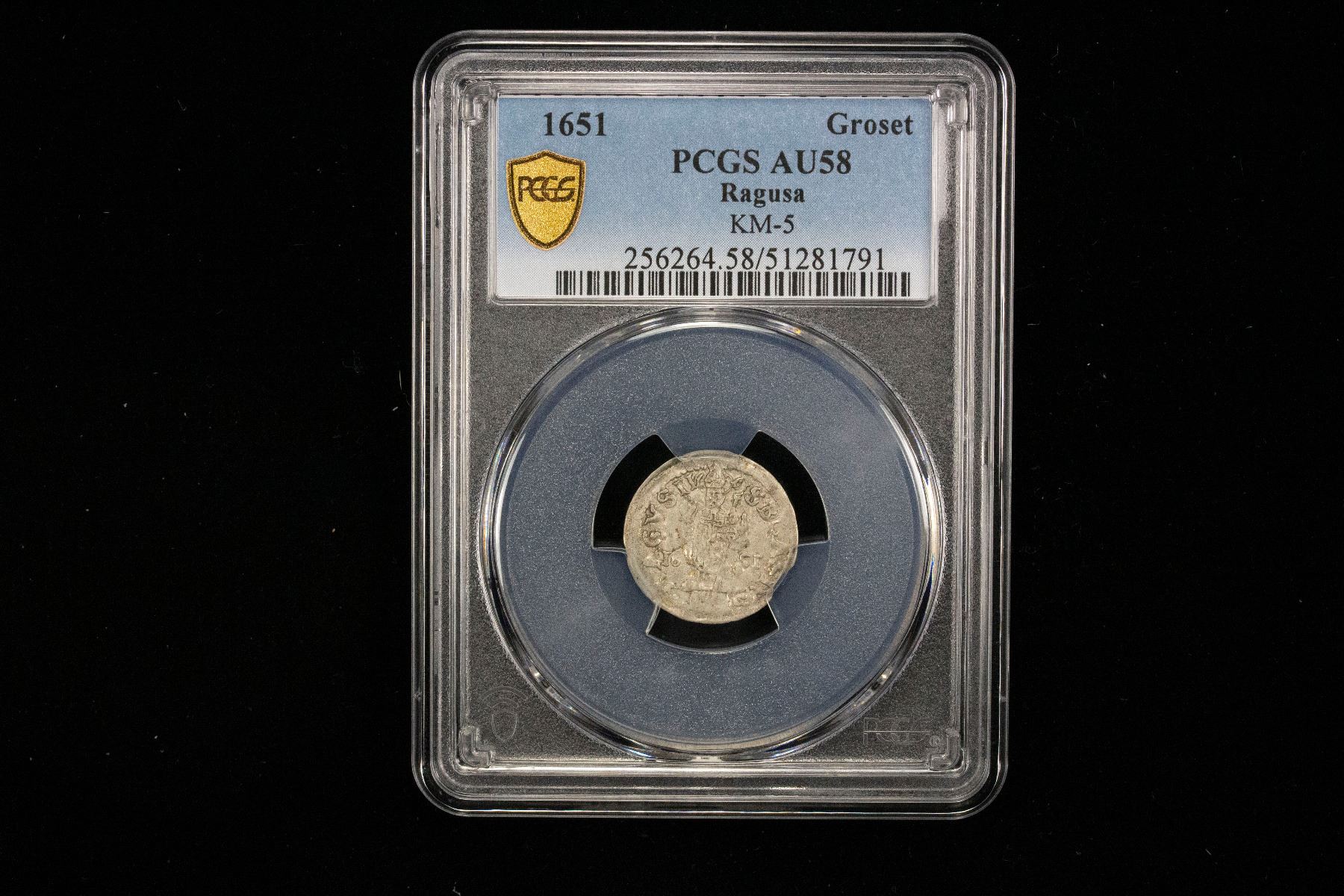 RAGUSA: Republic, AR grosetto / dinaric, 1651, KM-5, Saint Blase standing facing, right hand raised in benediction // Christ standing facing, right hand raised in benediction, the world in the left, an attractive nearly mint state example, PCGS graded AU58.