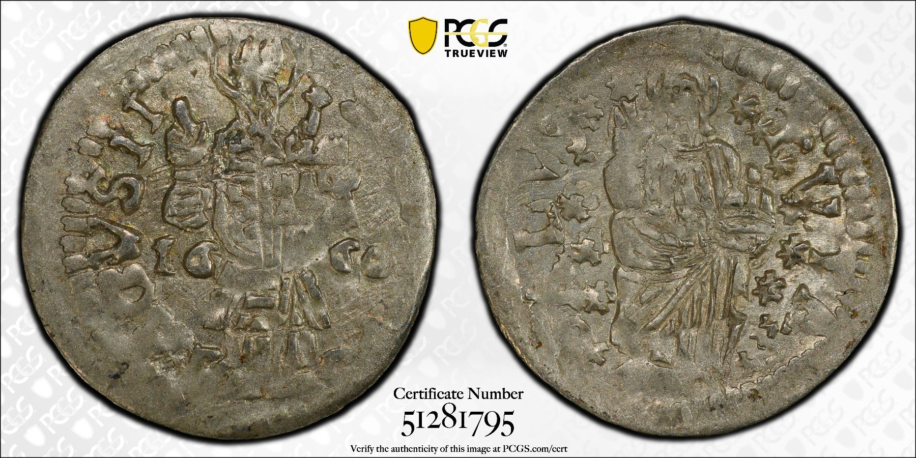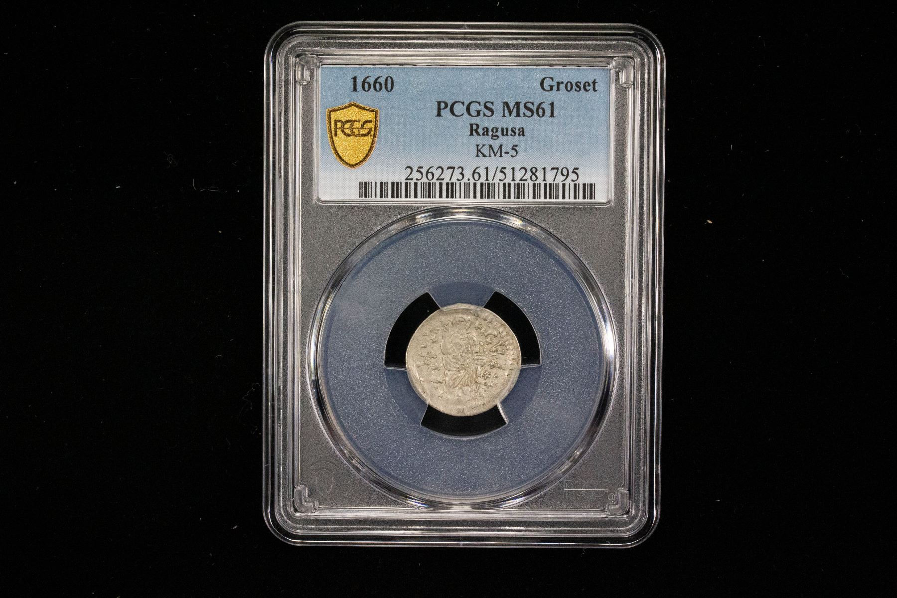 RAGUSA: Republic, AR grosetto / dinaric, 1660, KM-5, Saint Blase standing facing, right hand raised in benediction // Christ standing facing, right hand raised in benediction, the world in the left, a pleasant mint state example, PCGS graded MS61.