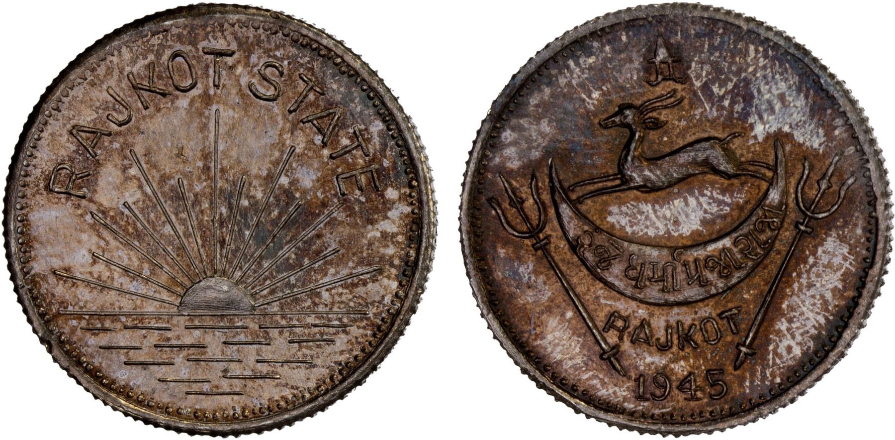 RAJKOT: Dharmendra, 1930-1948, AR medallic mohur, 1945, Bruce-1a, original strike, lustrous with light toning, accompanied by collector's information card, Unc, ex Anton Holt Collection. The original can be quickly distinguished by the trident, with the middle prong having a solid diamond about halfway along, whereas the restrike has a hollow circle instead of a solid diamond.
