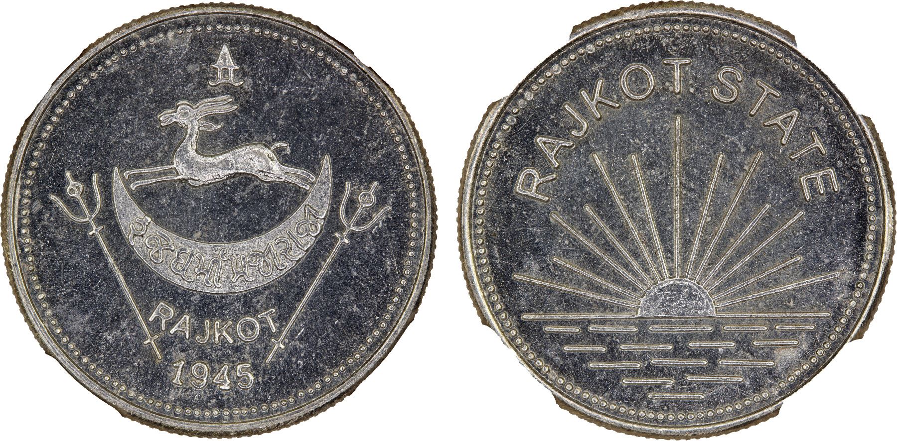 RAJKOT: Dharmendra Singh, 1930-1948, AR medallic mohur, 1945, KM-X1a, rising sun // civic coat-of-arms; restrike in silver, with a hollow circle instead of a solid diamond over the middle prong of the trident, NGC graded MS65.