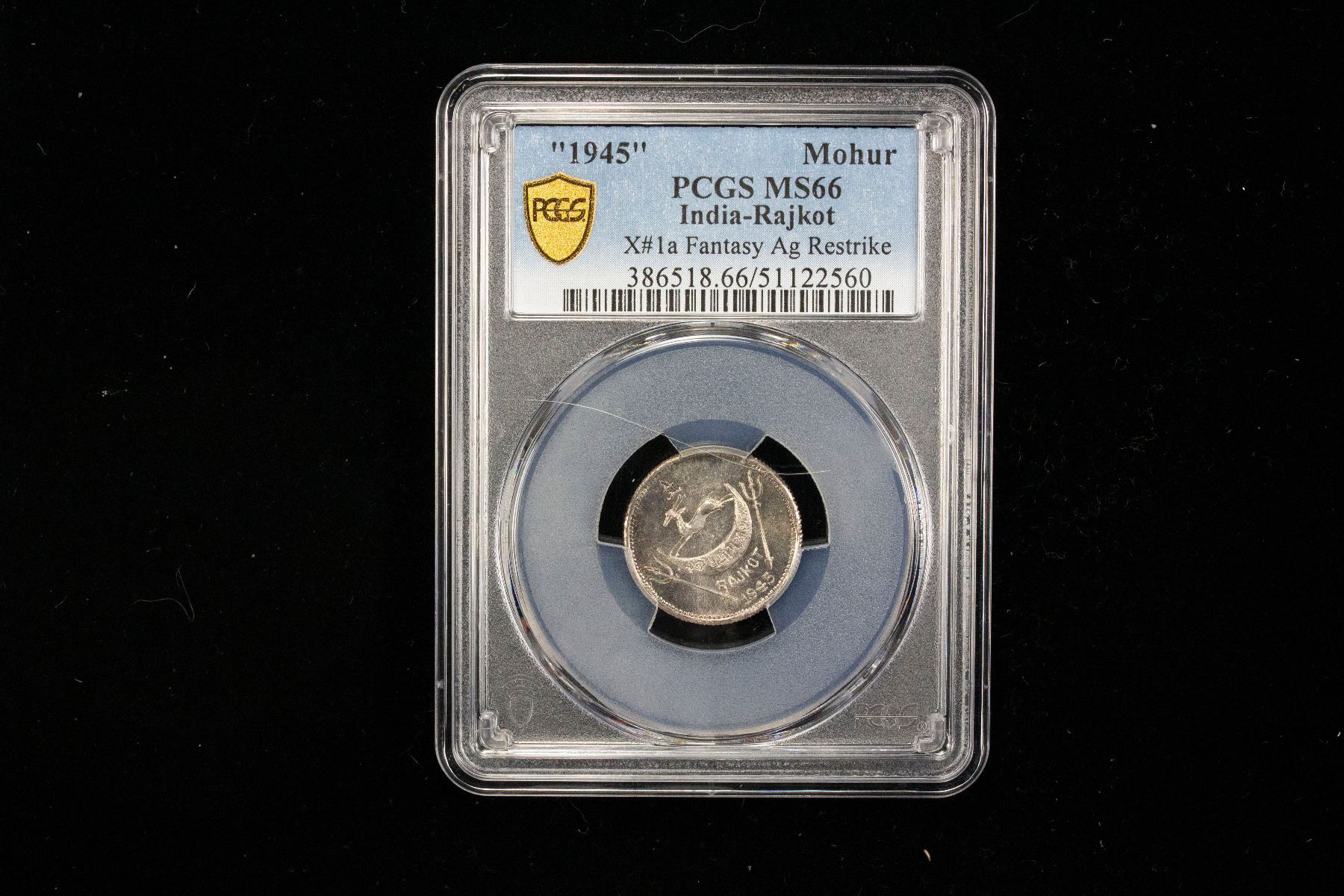 RAJKOT: Dharmendra Singh, 1930-1948, AR medallic mohur, 1945, KM-X1a, original strike, a fantastic example with superb luster, PCGS graded MS66. The original can be quickly distinguished by the trident, with the middle prong having a solid diamond about halfway along, whereas the restrike has a hollow circle instead of a solid diamond. This example is incorrectly labed 'restrike' on the PCGS holder but is an original strike.